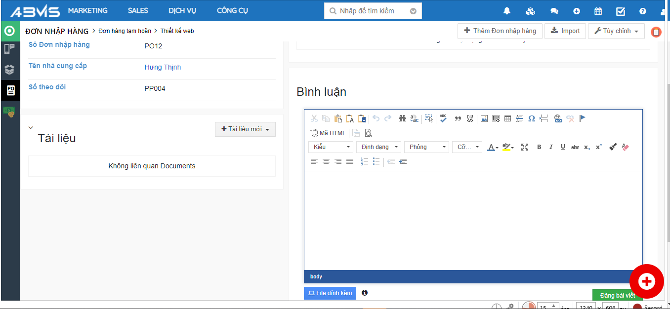 Để ghi chú thông tin, vấn đề liên quan cho từng bản ghi Đơn nhập hàng. Lựa chọn thao tác “Bình luận” cho bản ghi đó.