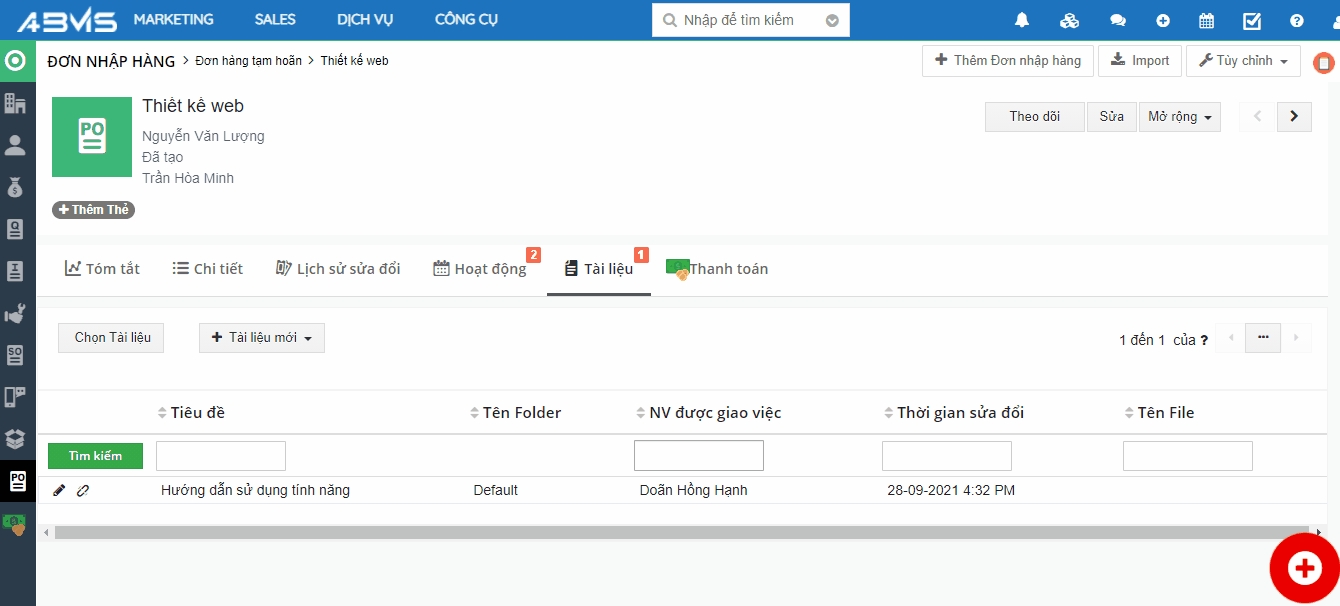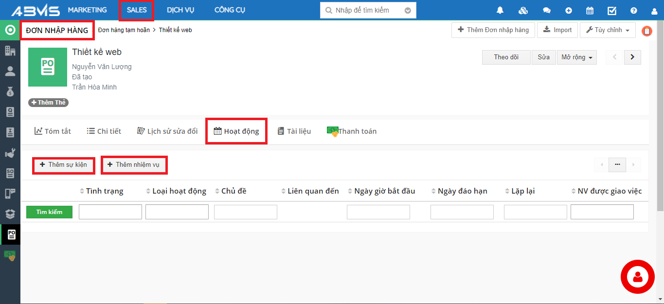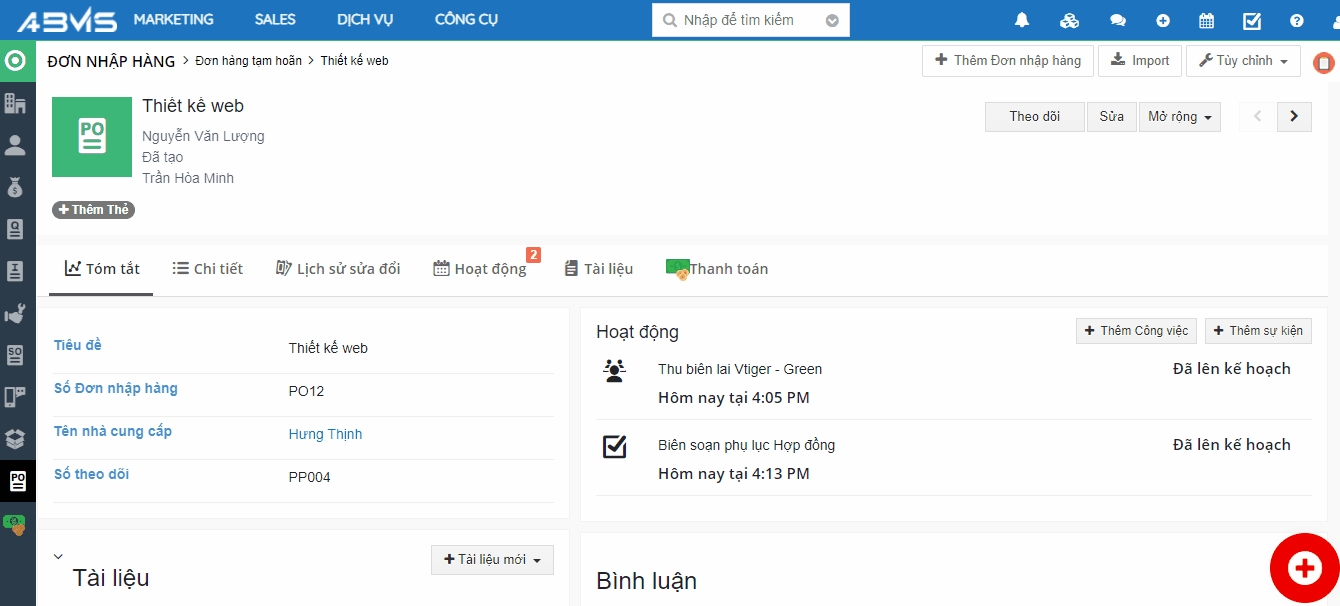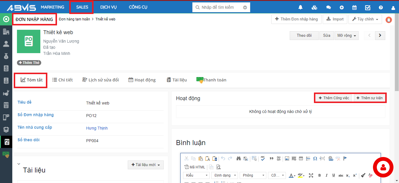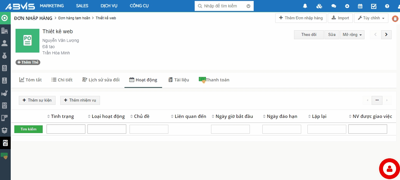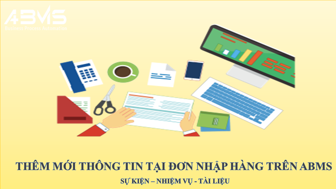 Thêm mới Sự kiện/ Nhiệm vụ/ Tài liệu tại Đơn nhập hàng trên ABMS