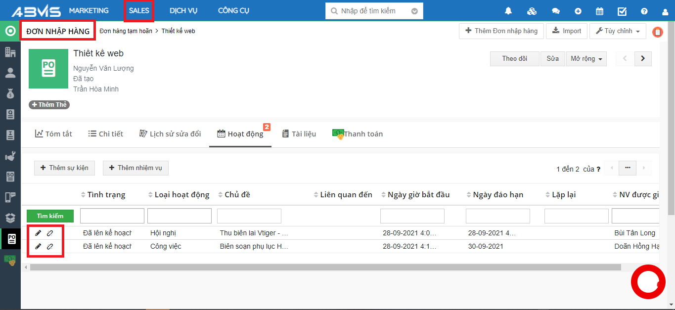 Cách 1: Bấm chọn “Hoạt động” trên thanh công việc => Trực tiếp chọn Thêm sự kiện/ Thêm công việc ngay trên màn hình thông tin