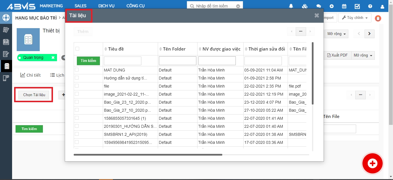 Tại thông tin chi tiết của Hạng mục bảo trì, chọn vào lệnh ” Tài liệu” để có thể thêm mới nội dung: