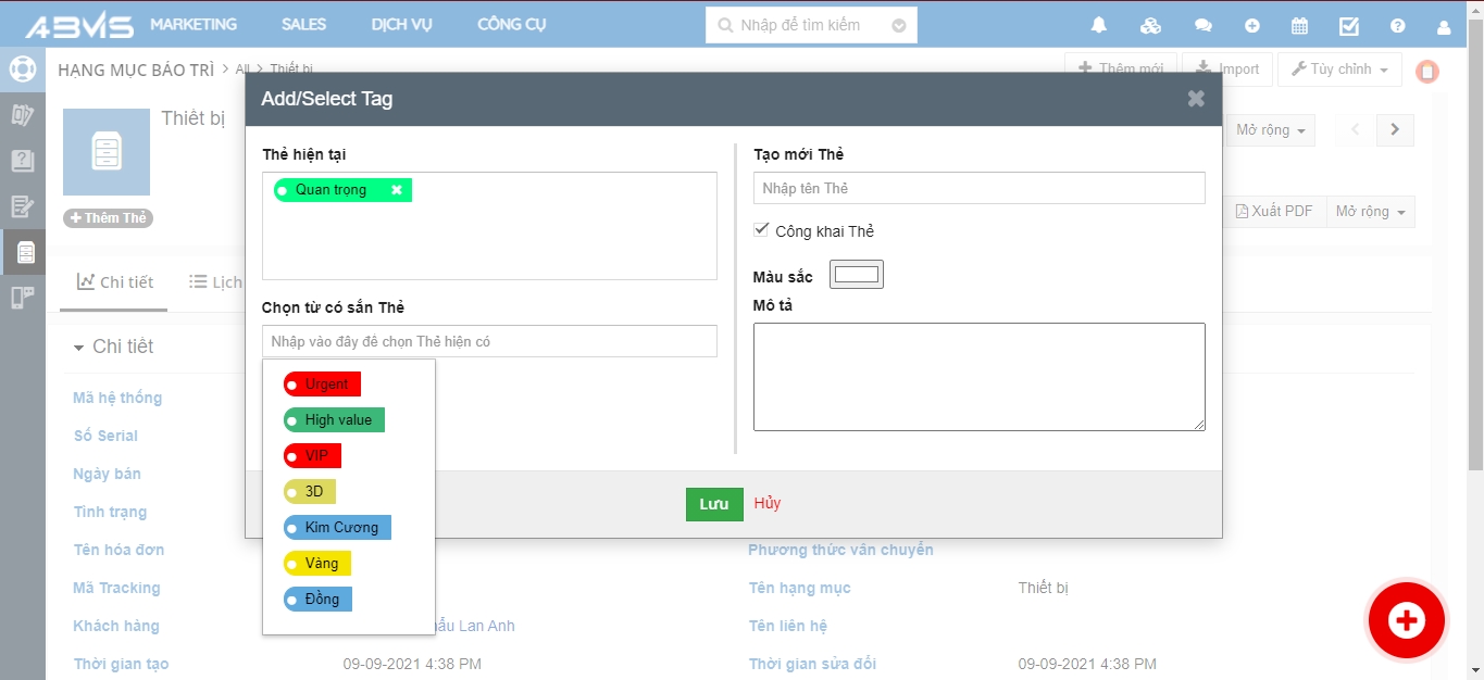 Bạn có thể “Tạo mới thẻ” phù hợp với nhu cầu bằng cách nhập thông tin thẻ, màu sắc, mô tả,…Hoặc có thể lựa chọn các thẻ có sẵn để thêm mới. Bấm “Lưu” sau khi thao tác thành công.