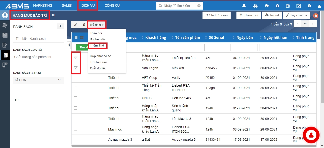 Đối với chọn nhiều Hạng mục cùng lúc => Chọn lệnh “Mở rộng” => Chọn “Thêm thẻ”