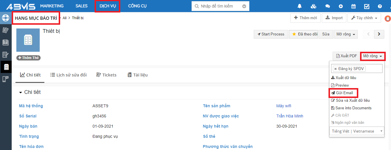 Thực hiện các thao tác tương như trên. Tại giao diện chi tiết của hạng mục bảo trì cần thao tác chọn lệnh “Mở rộng” => Chọn “Gửi Email”