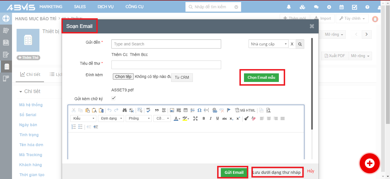 Tại đây bạn có thể chọn File đính kèm từ thiết bị hoặc chọn Mail mẫu có sẵn trên ABMS. Để hủy các thao tác lựa chọn bấm “Hủy”.
