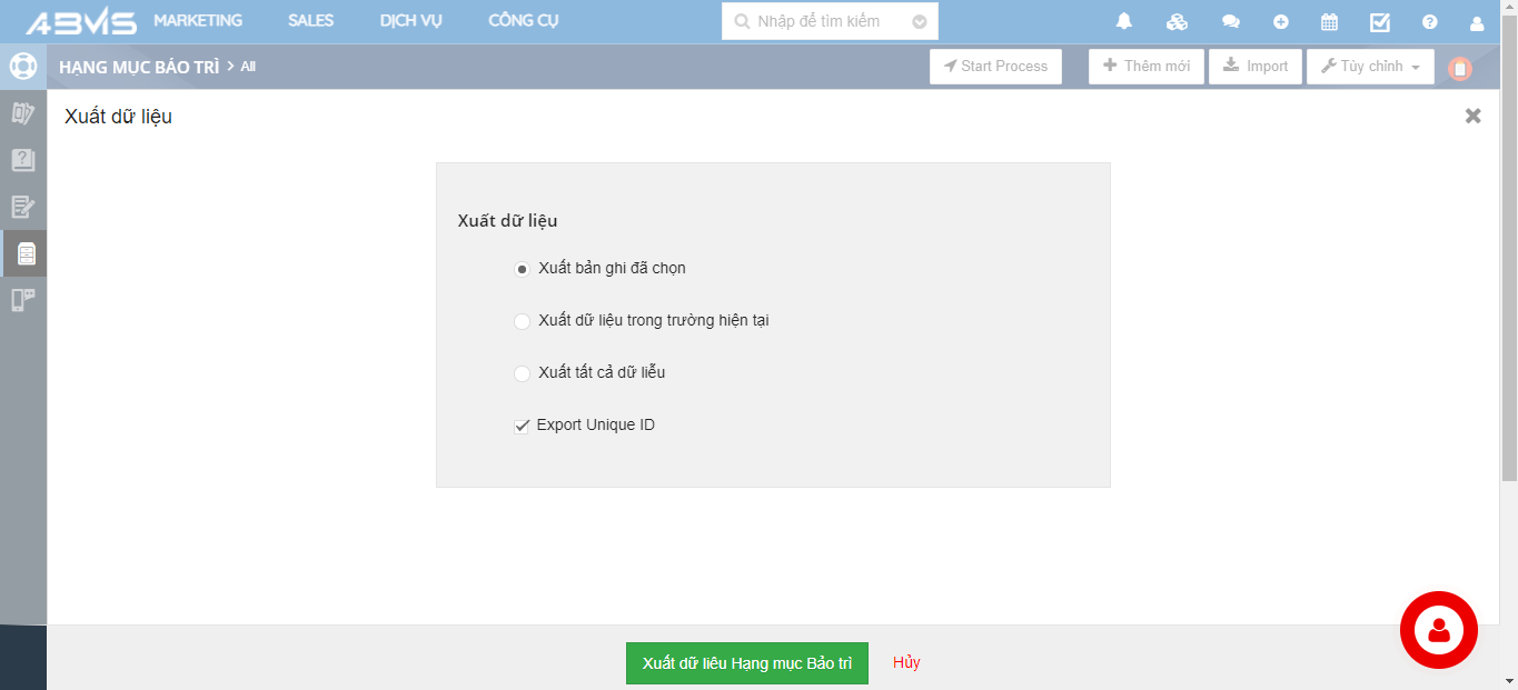 Xuất dữ liệu Hạng mục bảo trì trên ABMS