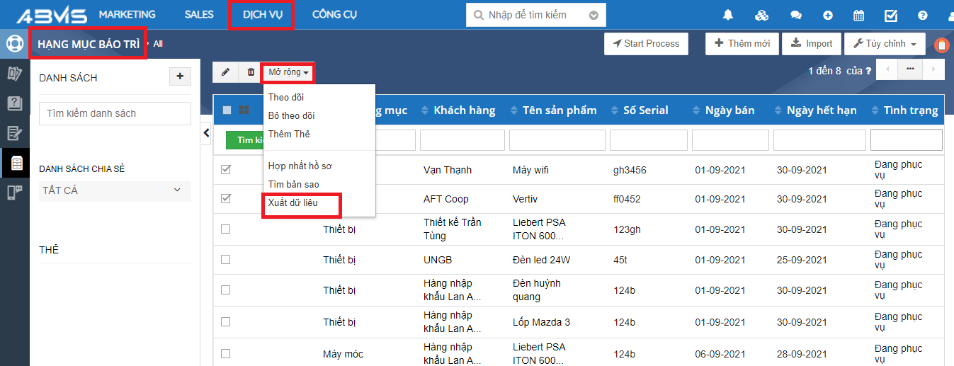Chọn Module Dịch vụ => Chọn Hạng mục bảo trì => Chọn một hoặc nhiều hạng mục bảo trì cần thao tác => Chọn lệnh “Mở rộng” => Chọn lệnh “Xuất dữ liệu”.
