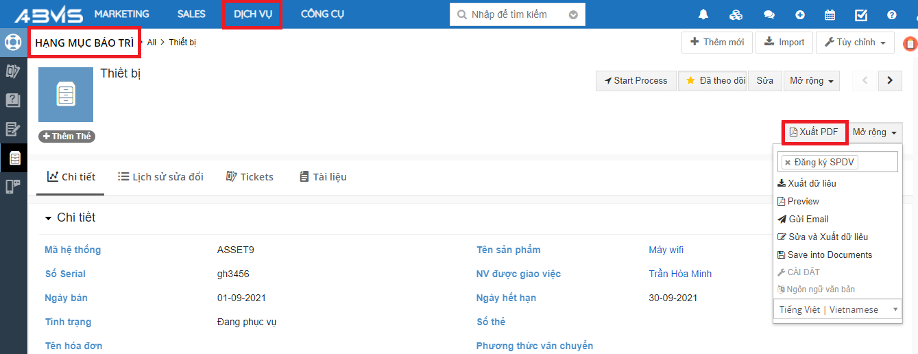 Hạng mục bảo trì trong phần mềm ABMS giúp cho doanh nghiệp quản lý thông tin một cách thuận tiện. Nắm bắt được các sản phẩm/dịch vụ cần hỗ trợ. Từ đó có thể chăm sóc khách hàng tốt nhất có thể. Bài viết này sẽ hướng dẫn các bạn cách xuất PDF và gửi Email hạng mục bảo trì trên ABMS.