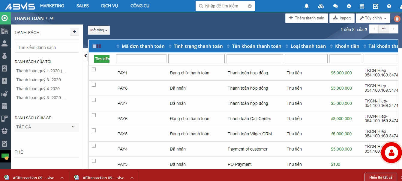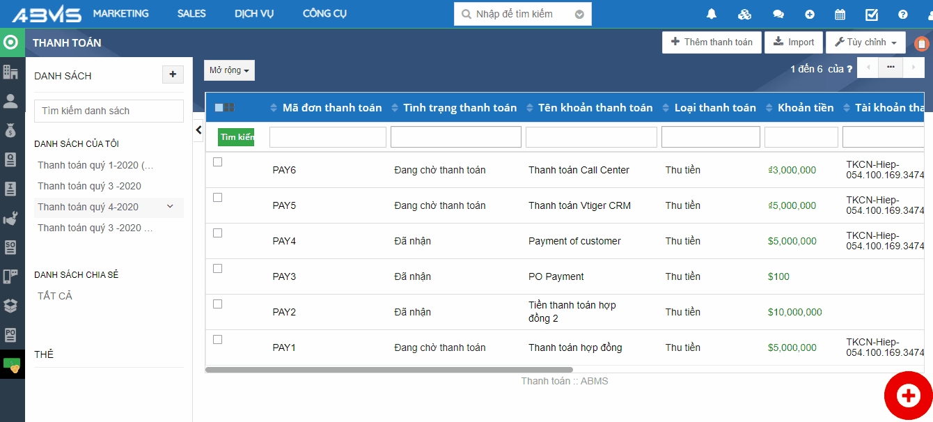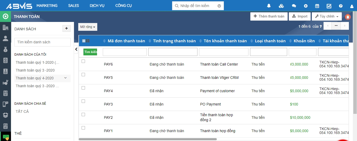 Sau khi thêm mới, thanh toán được tạo sẽ hiển thị trên giao diện màn hình tại “Danh sách lọc” bạn chọn hoặc mục “Tất cả danh sách chia sẻ”. Việc này giúp bạn có thể theo dõi một cách bao quát các thông tin.