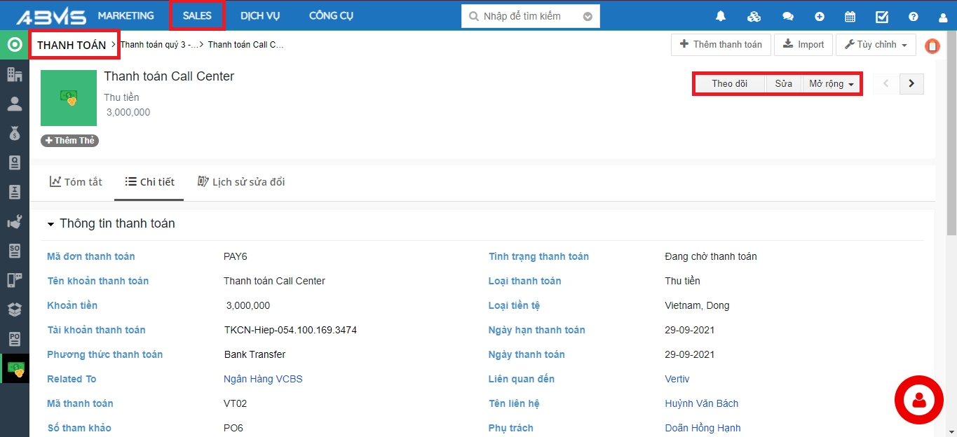 Bấm vào biểu tượng dấu ba chấm trước Thanh toán => Chọn “Chi tiết” => Các thông tin chi tiết của Thanh toán sẽ hiển thị như giao diện hình ảnh phía dưới => Chọn lệnh “Theo dõi” phía trên góc phải màn hình.