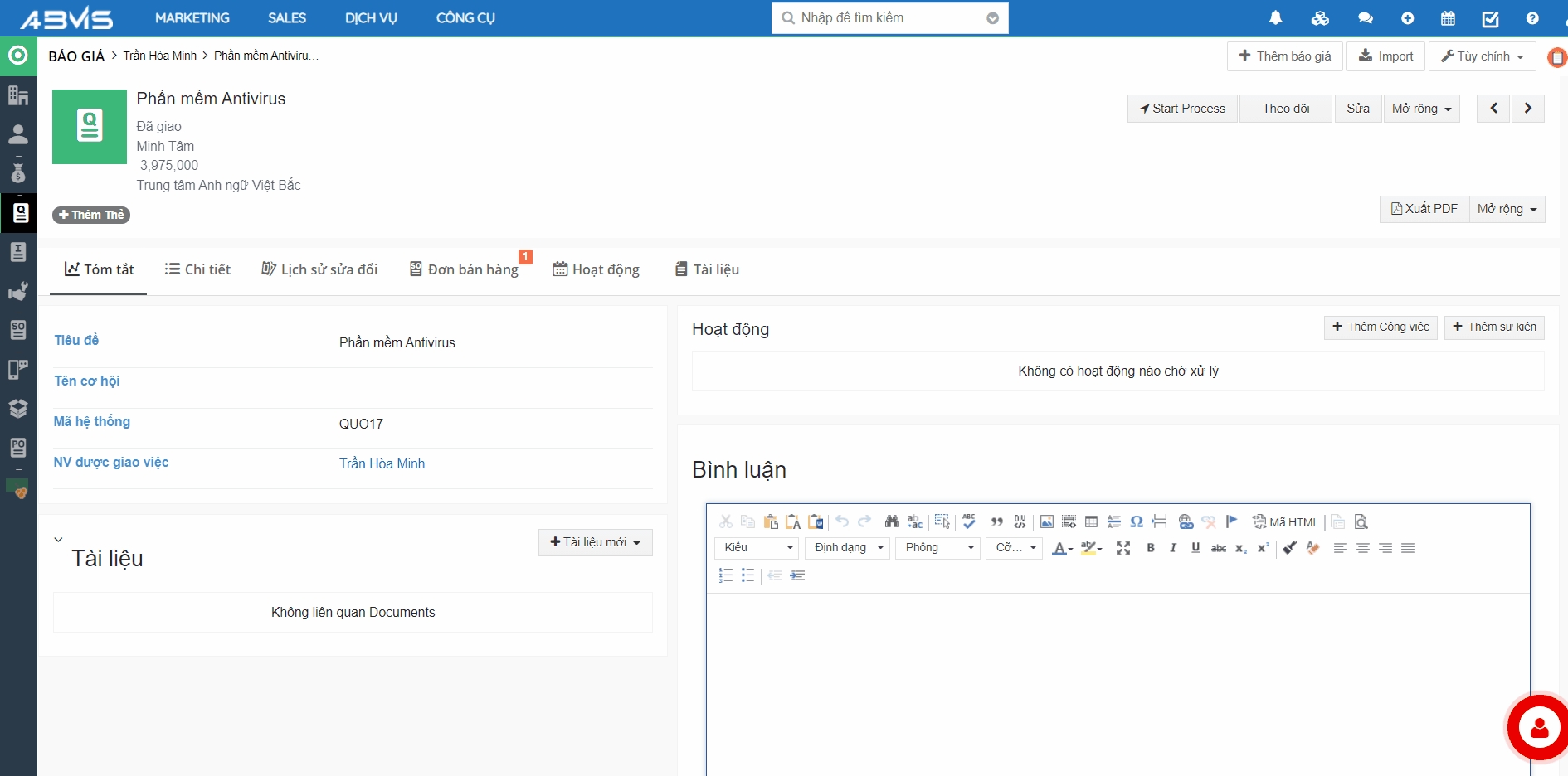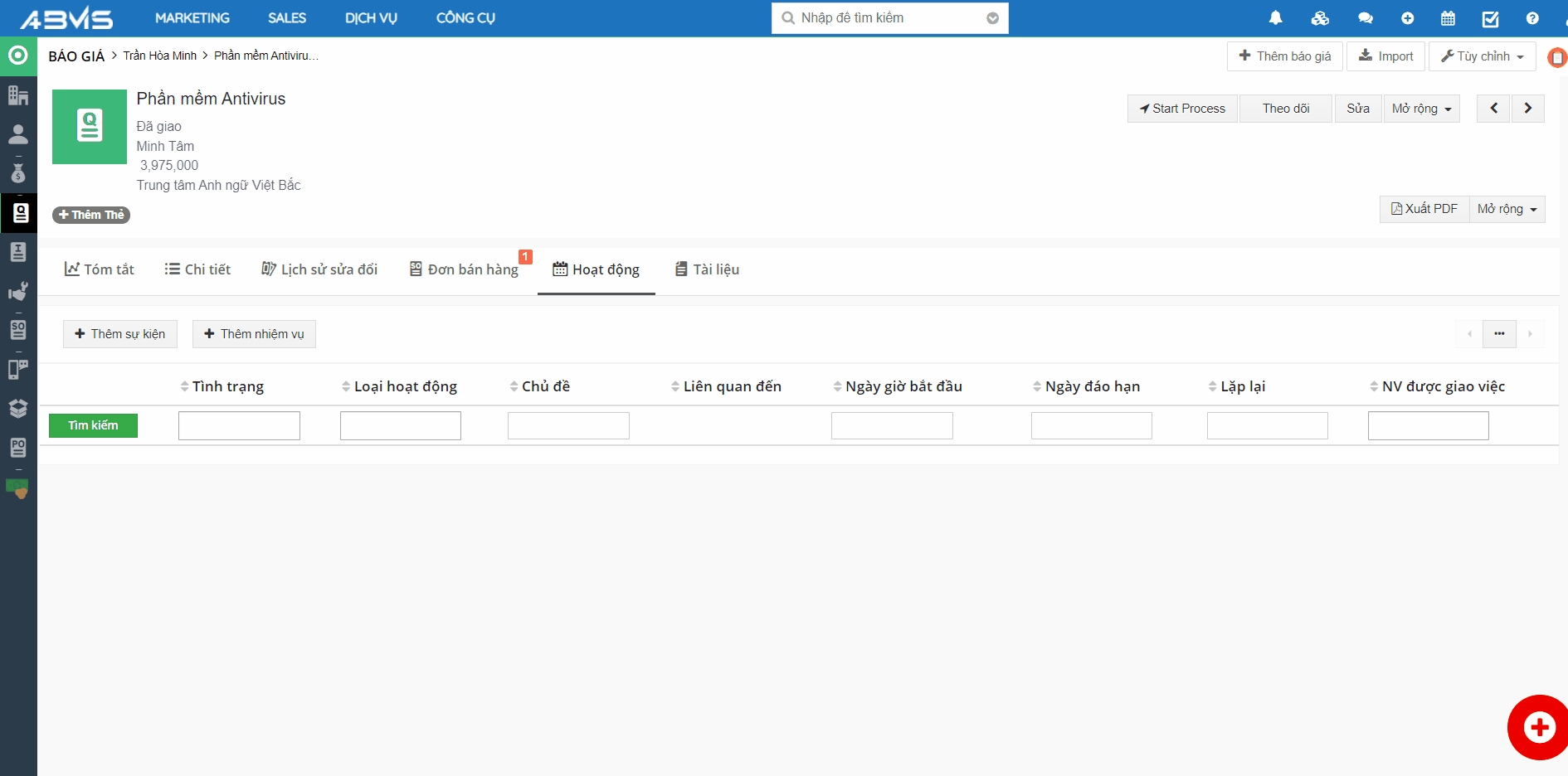 Thêm Sự kiện – Nhiệm vụ trên bản ghi Báo giá