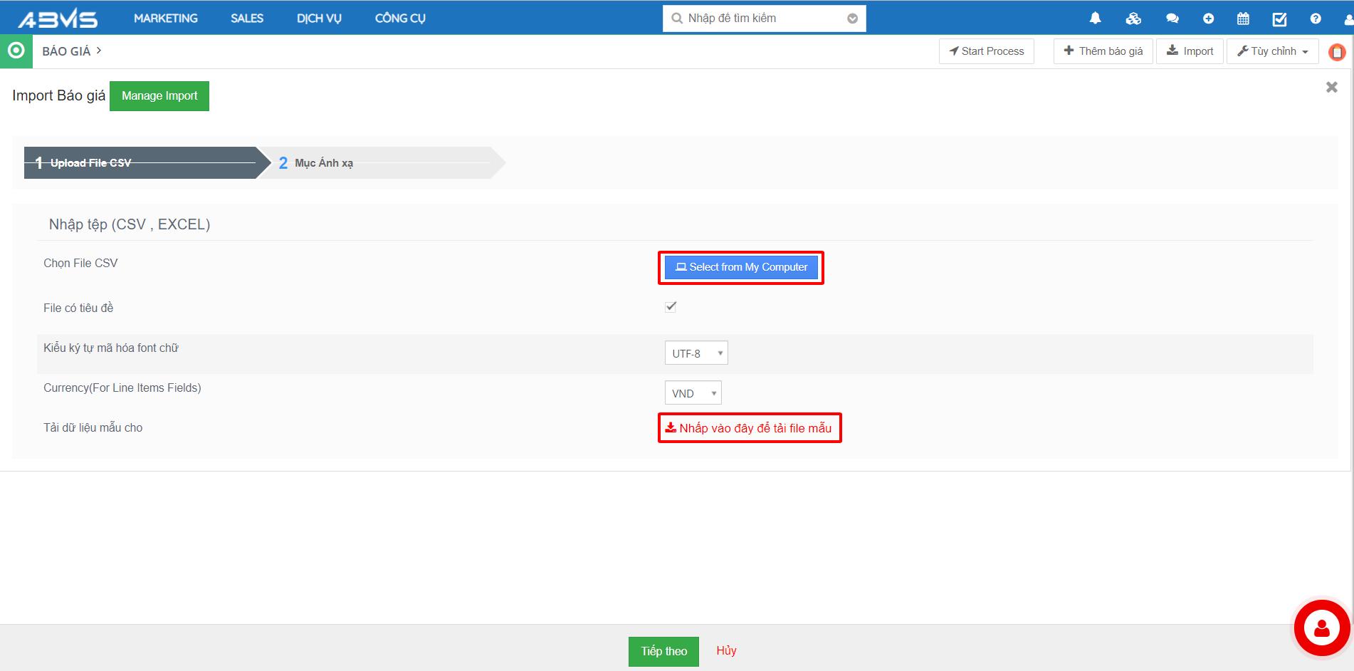 Tương tự như khi nhập dữ liệu tại các module khác, bạn cũng bấm chọn nút “Import” ở góc trên bên phải màn hình. Trên màn hình “Import Báo giá ”, bạn thực hiện lần lượt các bước: