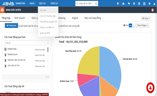 B1: Chọn module dịch vụ trên hệ thống ABMS => Chọn mục Yêu cầu