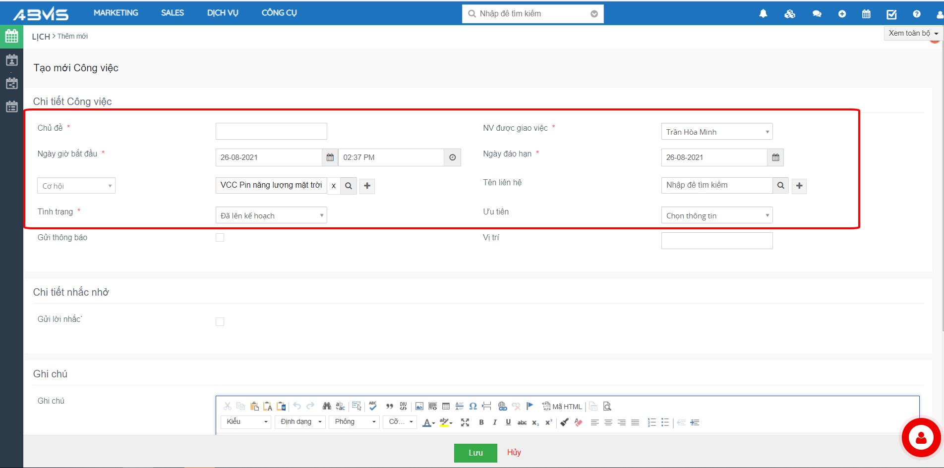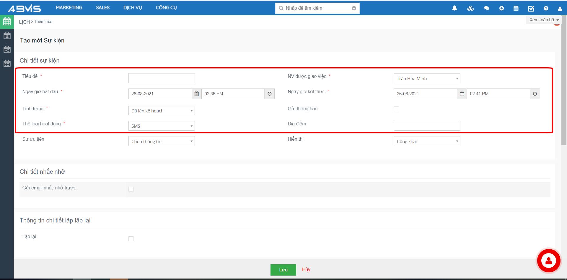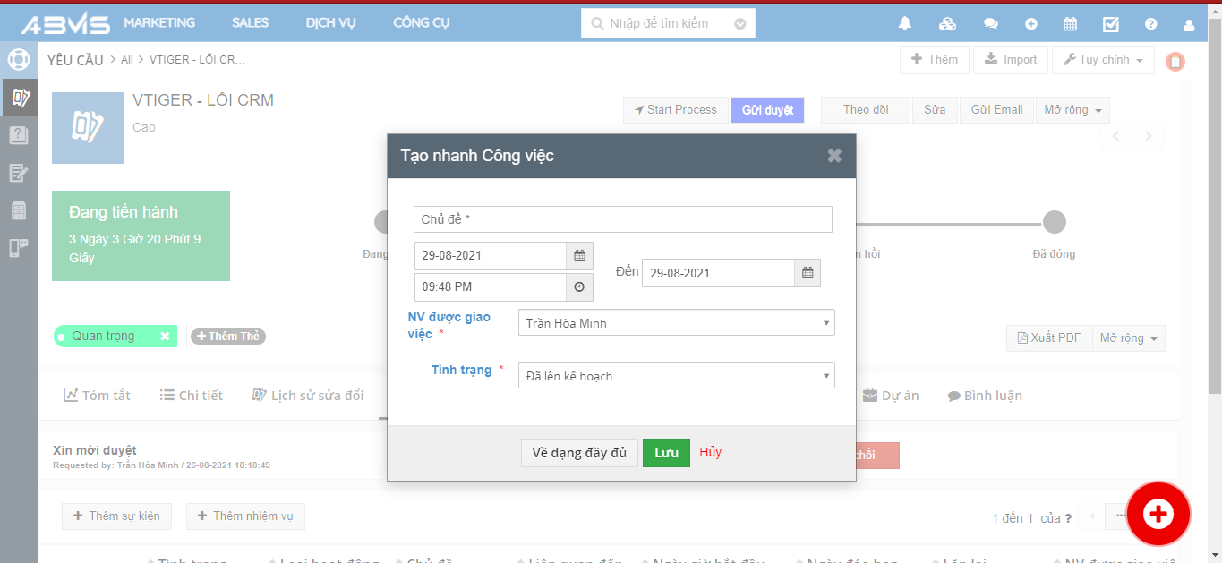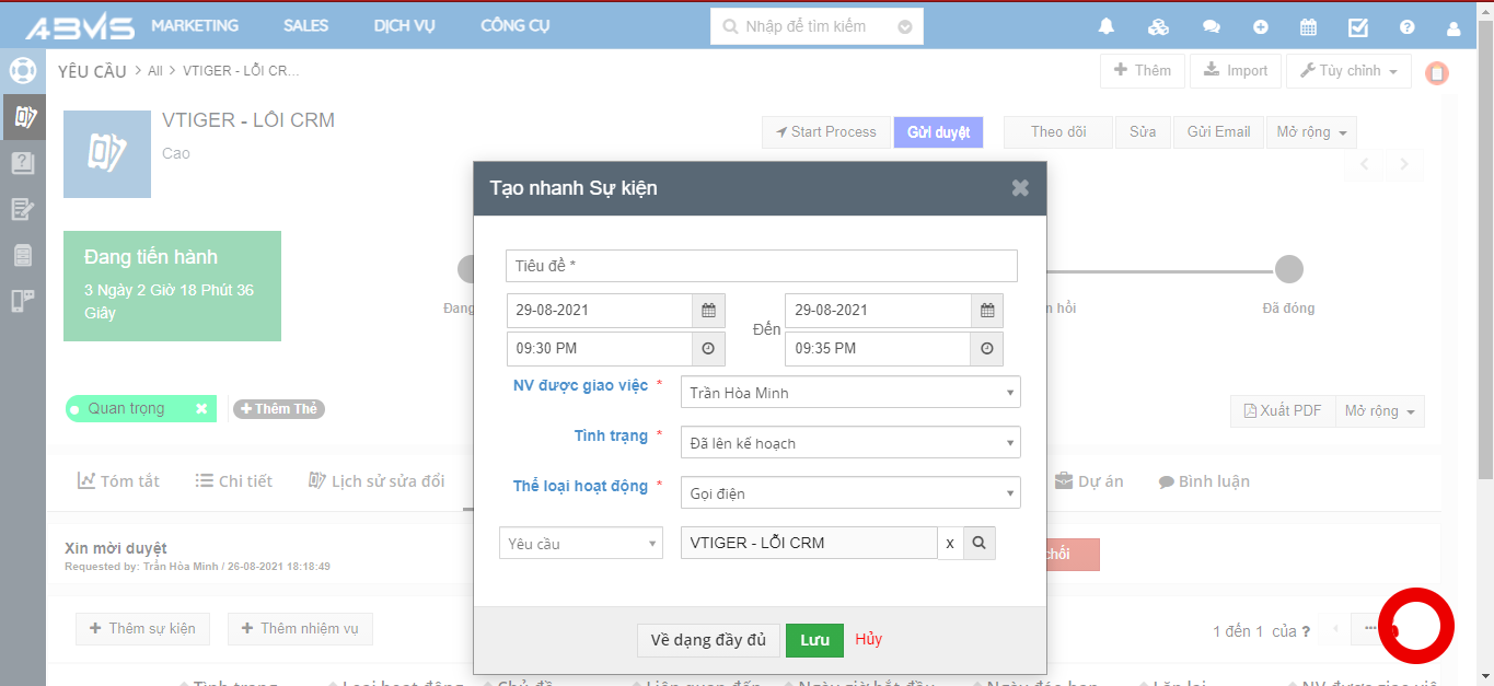 Tạo nhanh sự kiện bằng các thông tin chính như tiêu đề, thời gian, tình trạng, nhân viên được giao việc, thể loại hoạt động , yêu cầu….hoặc ” Về dạng đầy đủ”