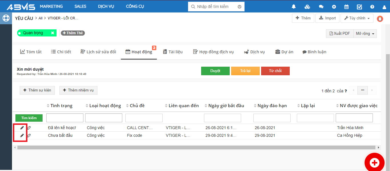 Để chỉnh sửa các thông tin đã tạo, trước mỗi sự kiện/ nhiệm vụ => Chọn biểu tượng “cây bút “