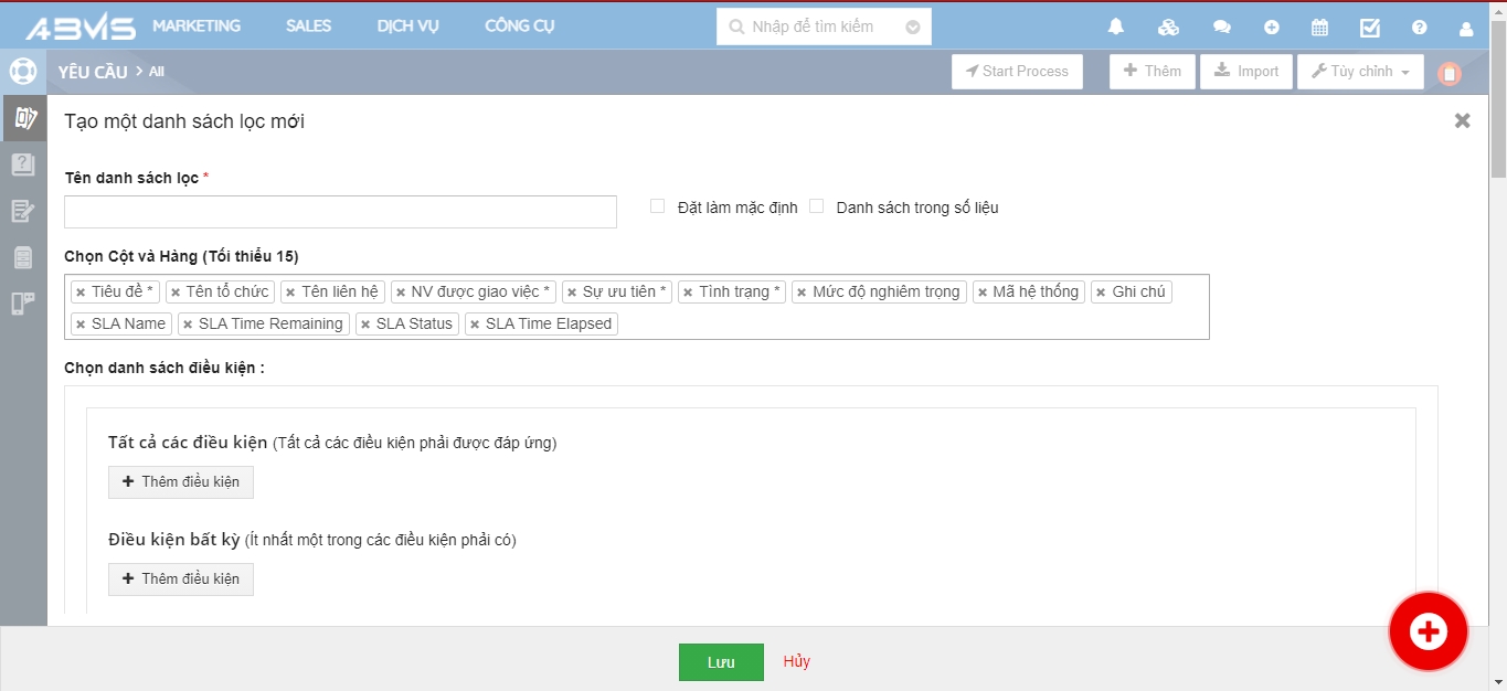 Màn hình sẽ hiển thị các thông tin cần thiết. Đặt tên cho danh sách yêu cầu cần tạo, lựa chọn các cột thông tin muốn hiển thị và đặt các điều kiện tương ứng. Sau đó bấm “Lưu” để hoàn tất tạo mới danh sách lọc.