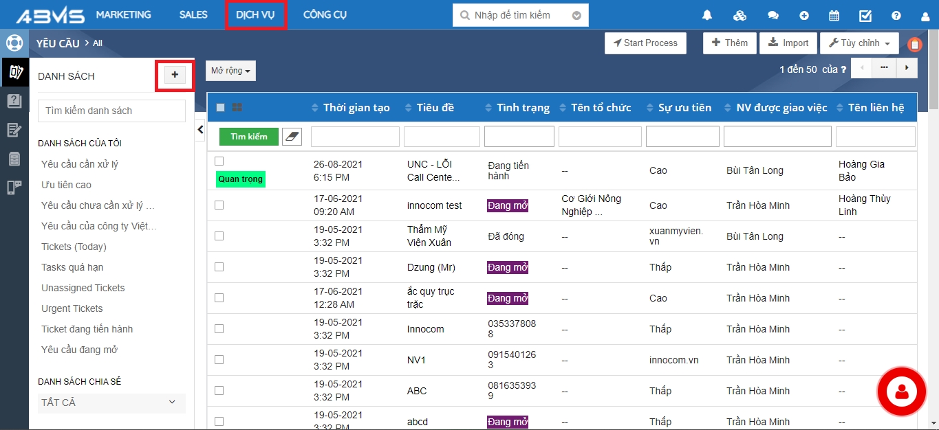 Chọn Module Dịch vụ =>Yêu cầu => Bấm chọn vào dấu ” + “ở bên trái màn hình để tạo thêm danh sách lọc mới.