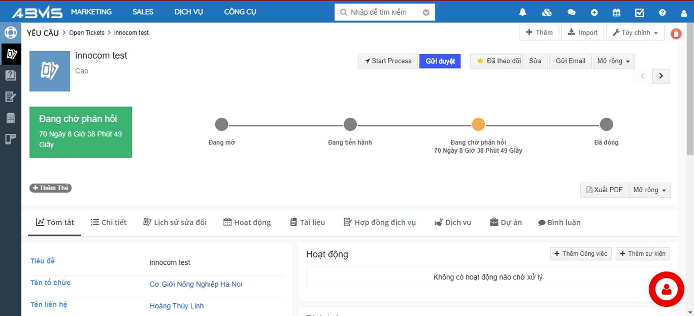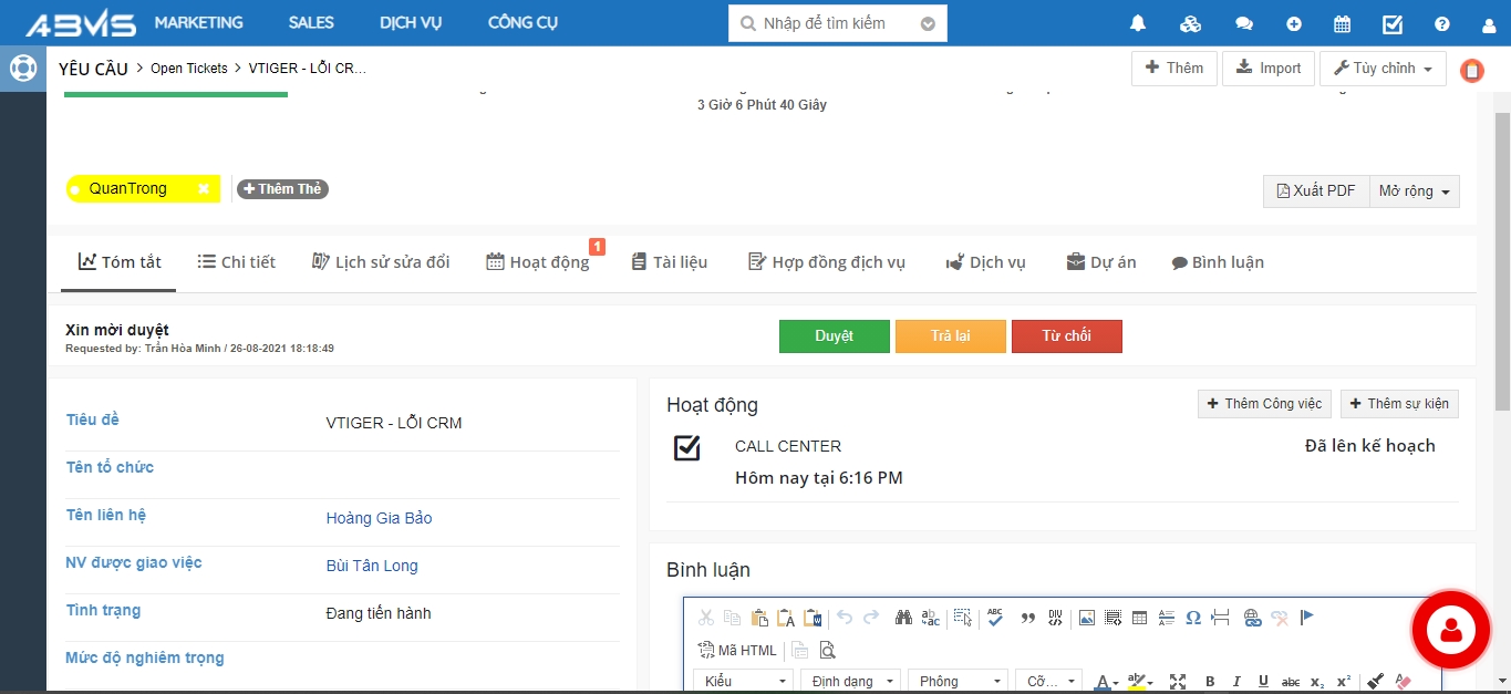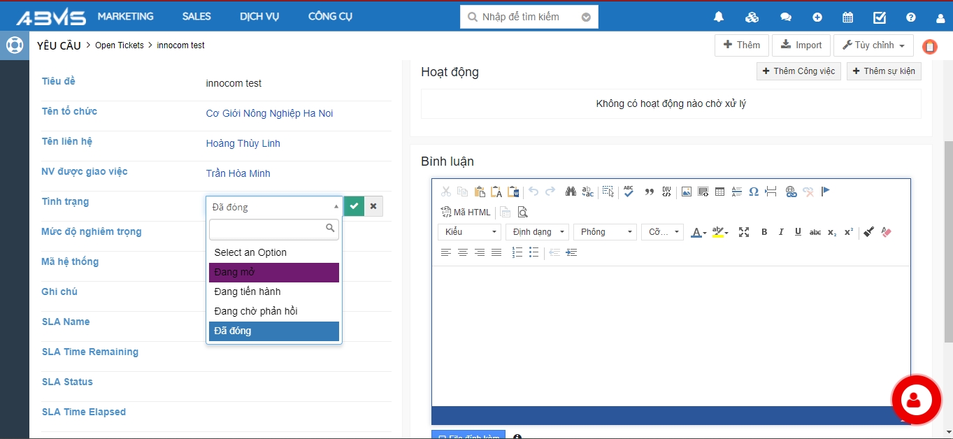 Thông thường một yêu cầu mới được tạo sẽ ở tình trạng “đang mở”. Người phụ trách sau khi tiếp nhận và xử lý sẽ thay đổi tình trạng của ticket và “gửi duyệt”. Quy trình tiếp diễn cho đến khi kết thúc yêu cầu (Đã đóng).