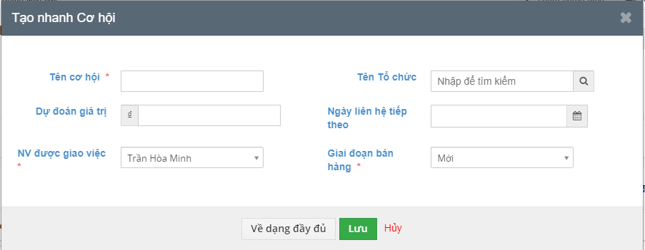 Tại đây, bạn có thể tạo nhanh cơ hội hoặc chọn Về dạng đầy đủ để nhập thông tin chi tiết cần tạo => Bấm Lưu
