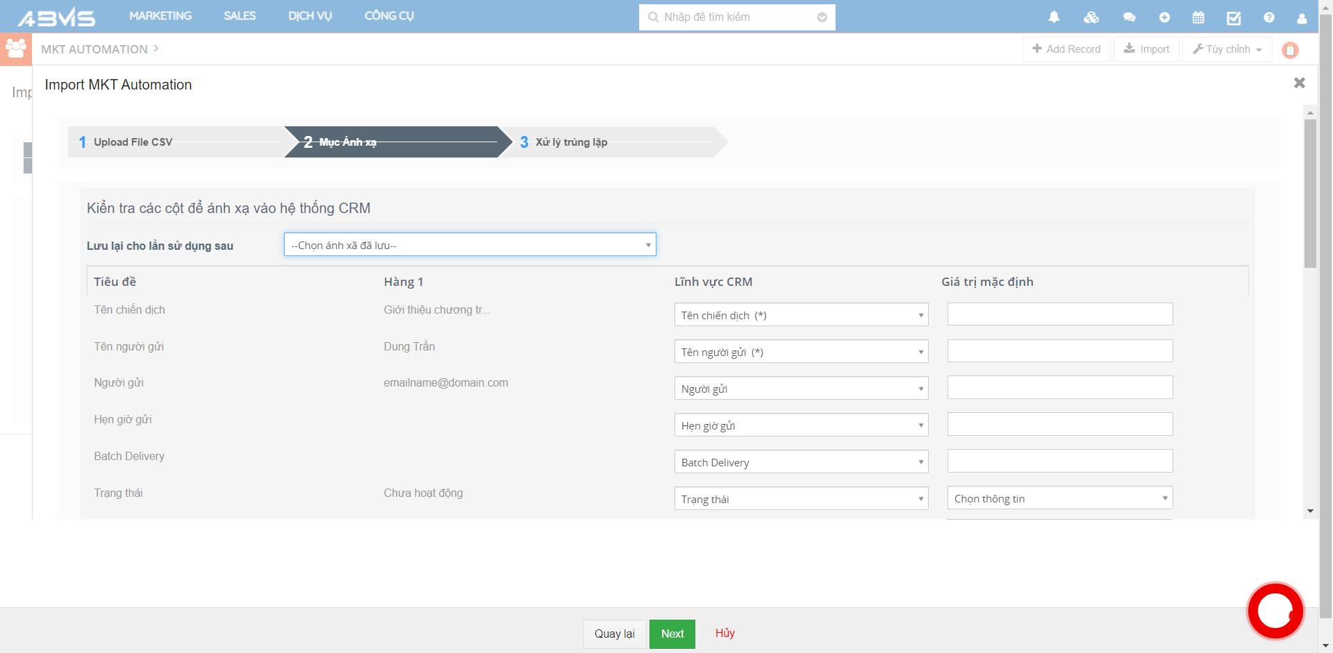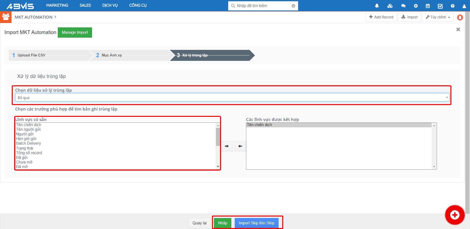 Để nhập chiến dịch Marketing vào ABMS, bạn chọn nút “Import” ở góc trên bên phải màn hình.