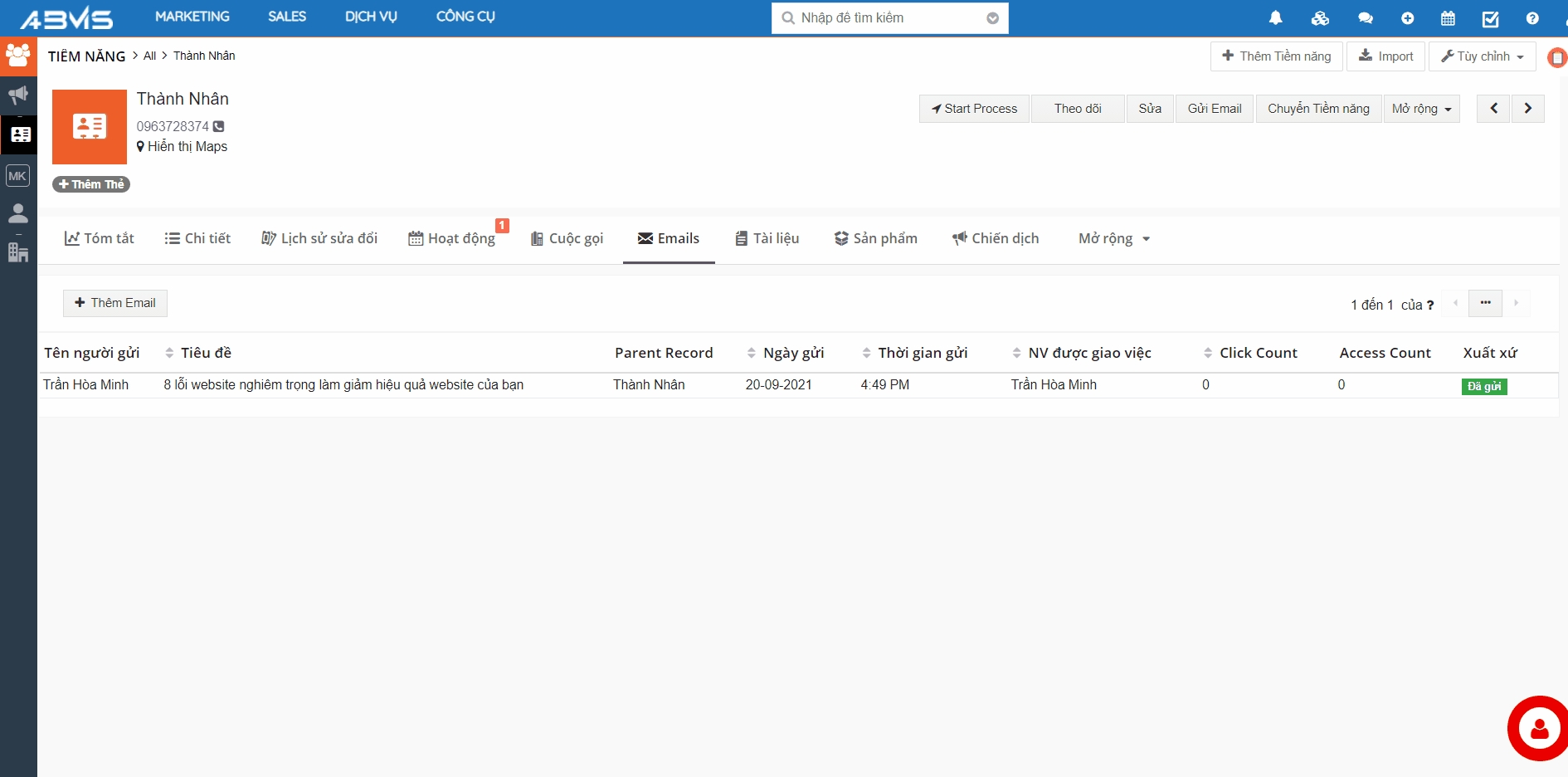 Gửi Email tại bản ghi Khách hàng Tiềm năng