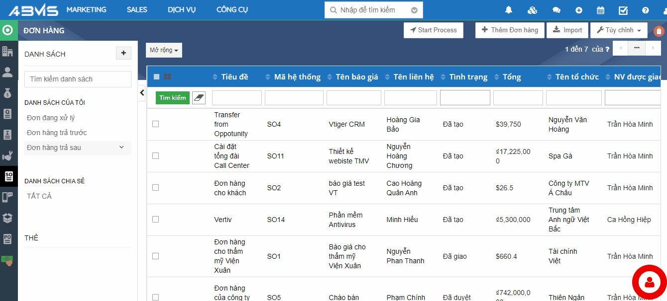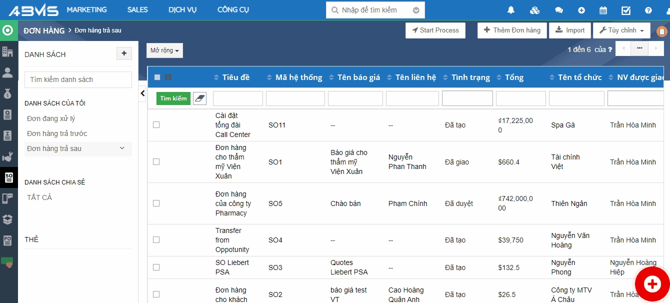 Tạo mới Danh sách lọc & Thêm mới Đơn hàng trên ABMS