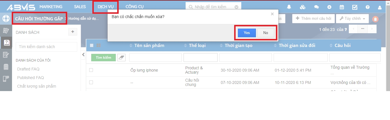 Chọn FAQ cần xóa => Chọn lệnh “Xóa” => Chọn Yes để xác nhận, No để hủy bỏ thao tác lệnh.
