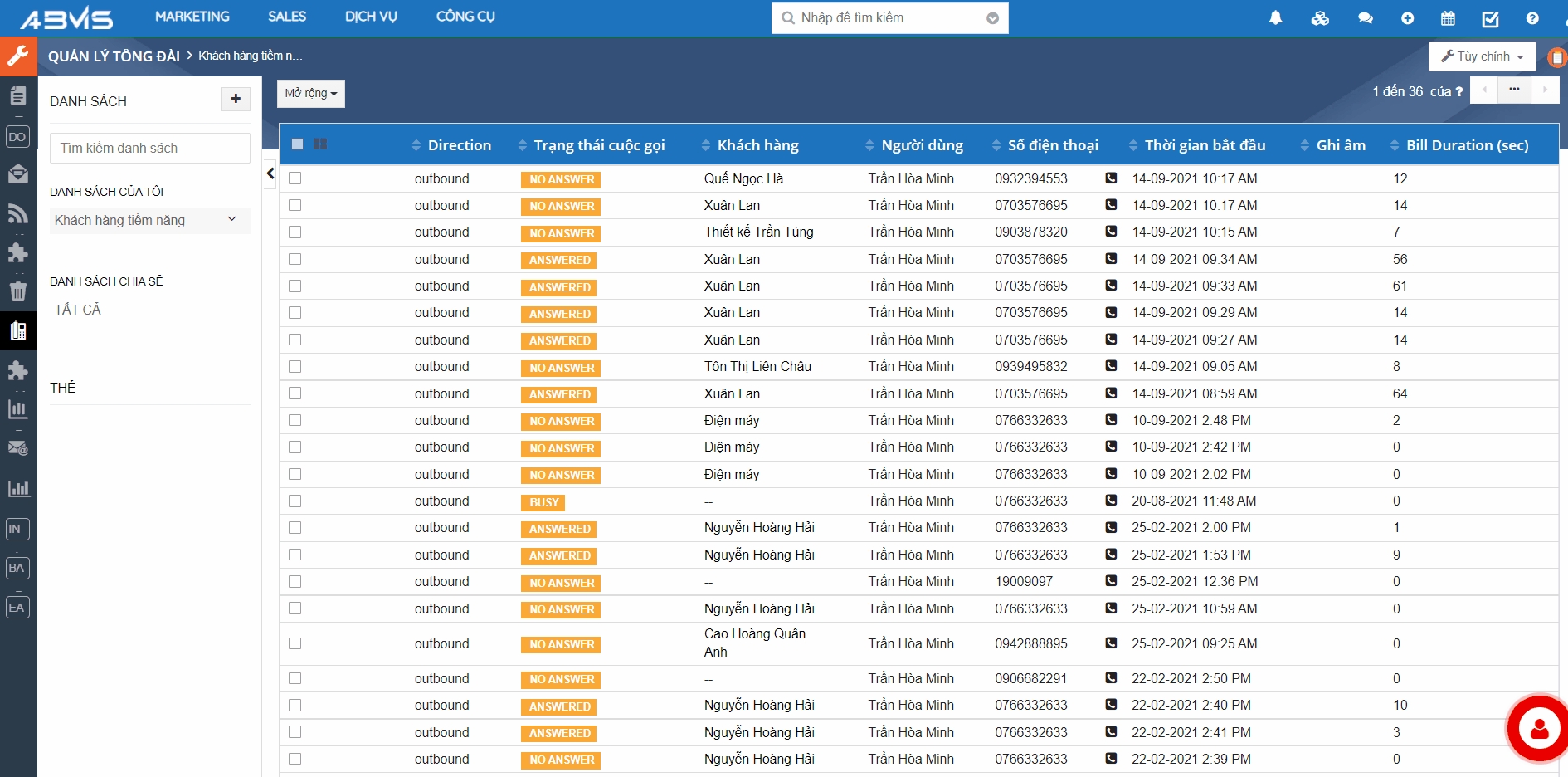 Để nghe file ghi âm, bạn bấm chọn cuộc gọi đến khách hàng cần nghe lại. Sau đó ở mục ghi âm bấm chọn vào chữ “WAV” màu đỏ.