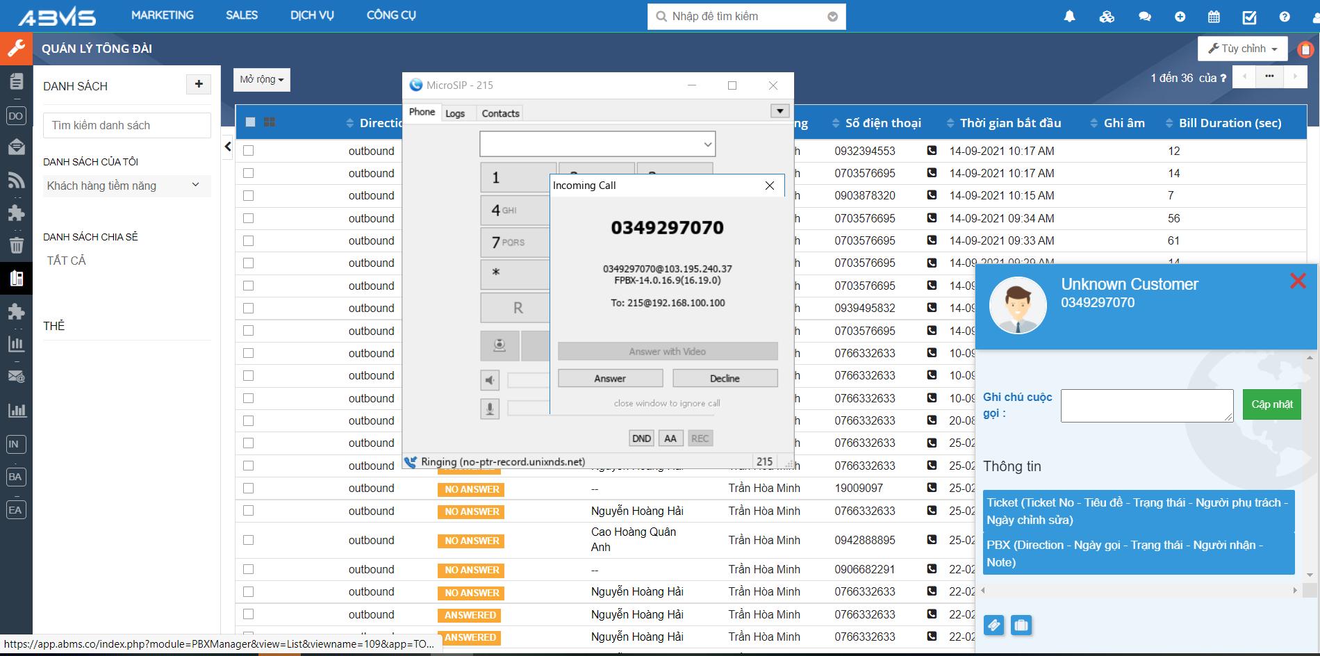 Hệ thống hiển thị cổng Incoming Call đến số mã extension của bạn. Chọn Answer để tiếp tục. Phần mềm MicroSIP sẽ hiển thị và thực hiện cuộc gọi đến khách hàng. Đồng thời hệ thống ABMS cũng pop up lên thông tin của khách hàng đó ở bên phải màn hình.