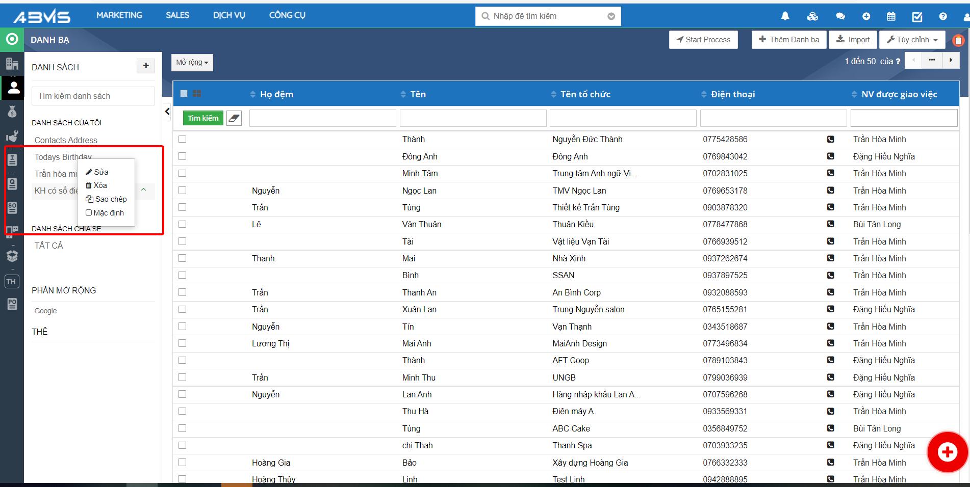 Để bổ sung, chỉnh sửa thông tin hoặc xóa từng Danh sách Danh bạ cụ thể, bạn nhấp chuột bên phải Tên danh bạ. Sau đó lựa chọn thao tác tương ứng.