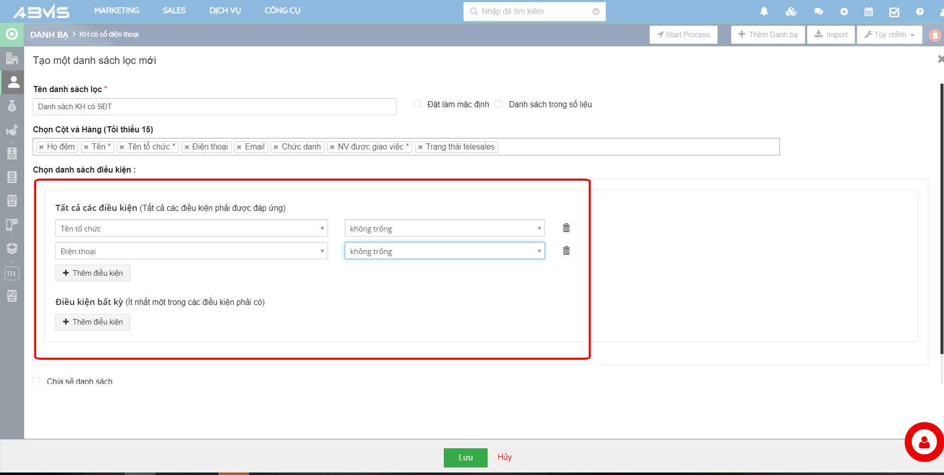 Hệ thống sẽ hiển thị trang Tạo một danh sách lọc mới. Tại đây, bạn sẽ điền các thông tin cơ bản và cần thiết sau: