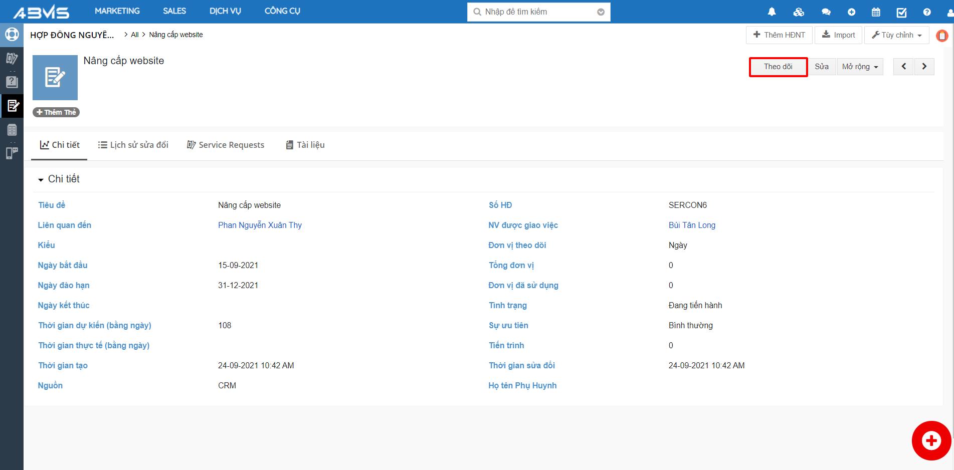Ở góc phải màn hình của bản ghi Hợp đồng nguyên tắc cần Theo dõi, bạn bấm chọn nút “Theo dõi”. Bấm thêm lần nữa để Bỏ theo dõi.