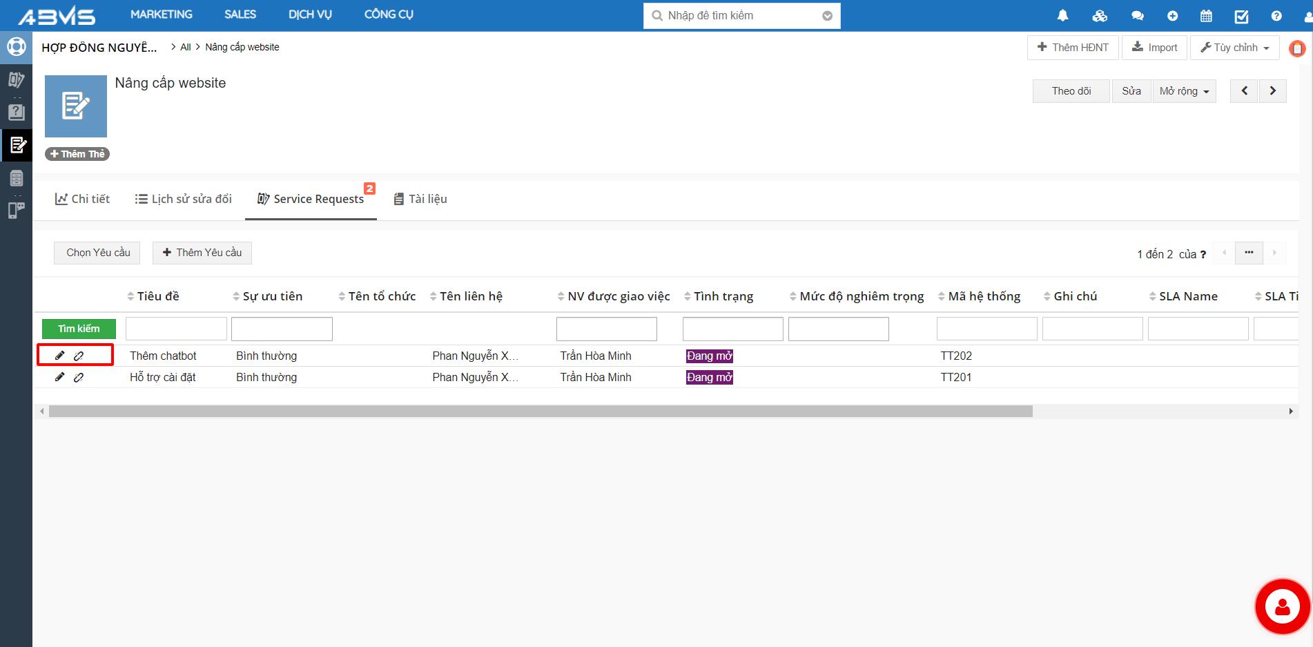 Để chỉnh Sửa hoặc Xóa yêu cầu, bạn lần lượt bấm chọn icon “bút chì”, hoặc “mắc xích” ngay trước yêu cầu đó.