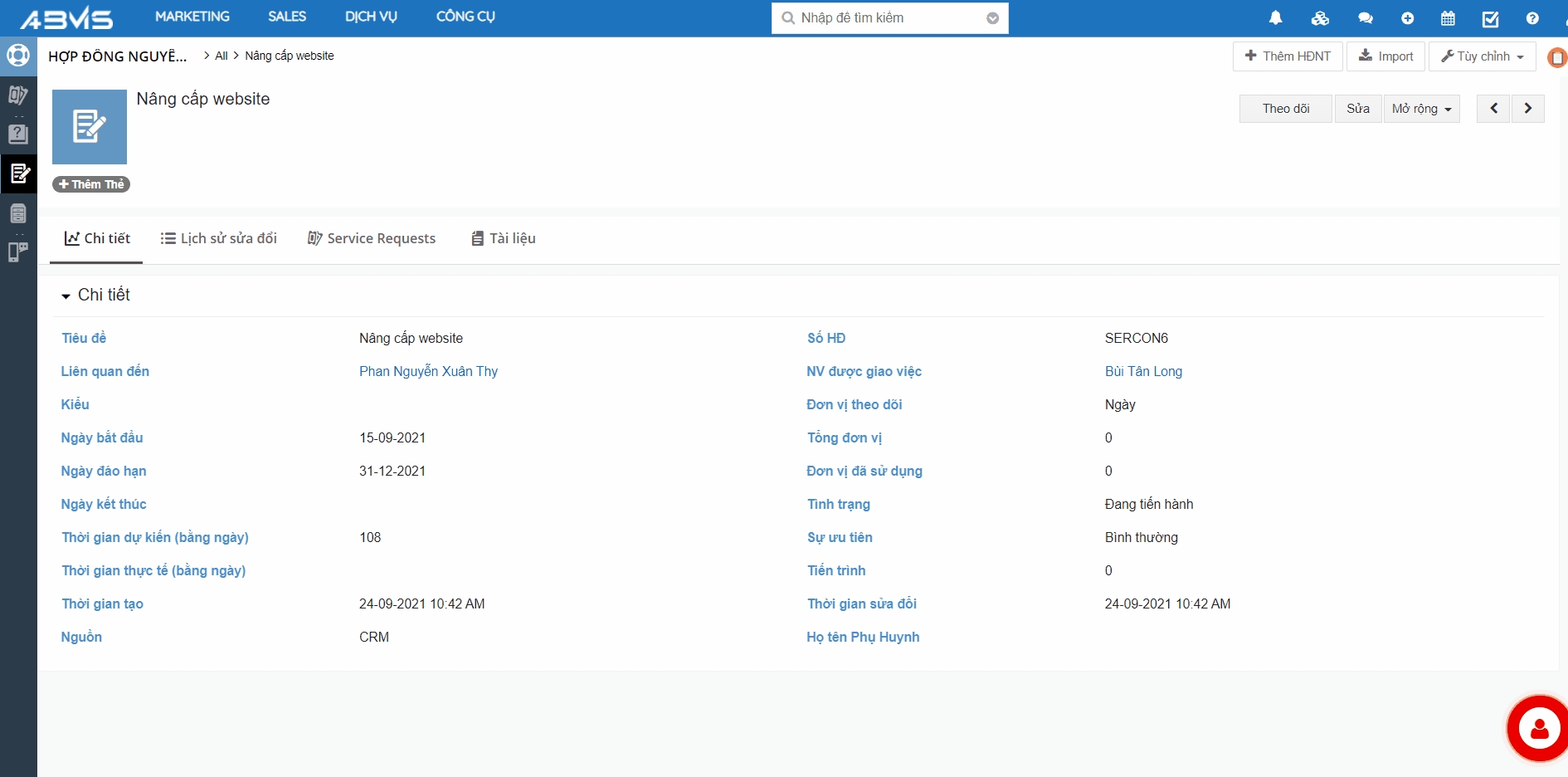 Để thêm yêu cầu mới cho bản ghi Hợp đồng nguyên tắt, bạn mở tab “Yêu cầu”/ “Service Request”.