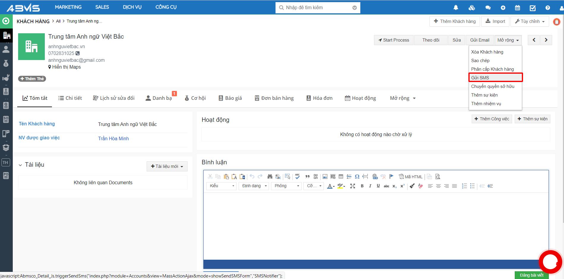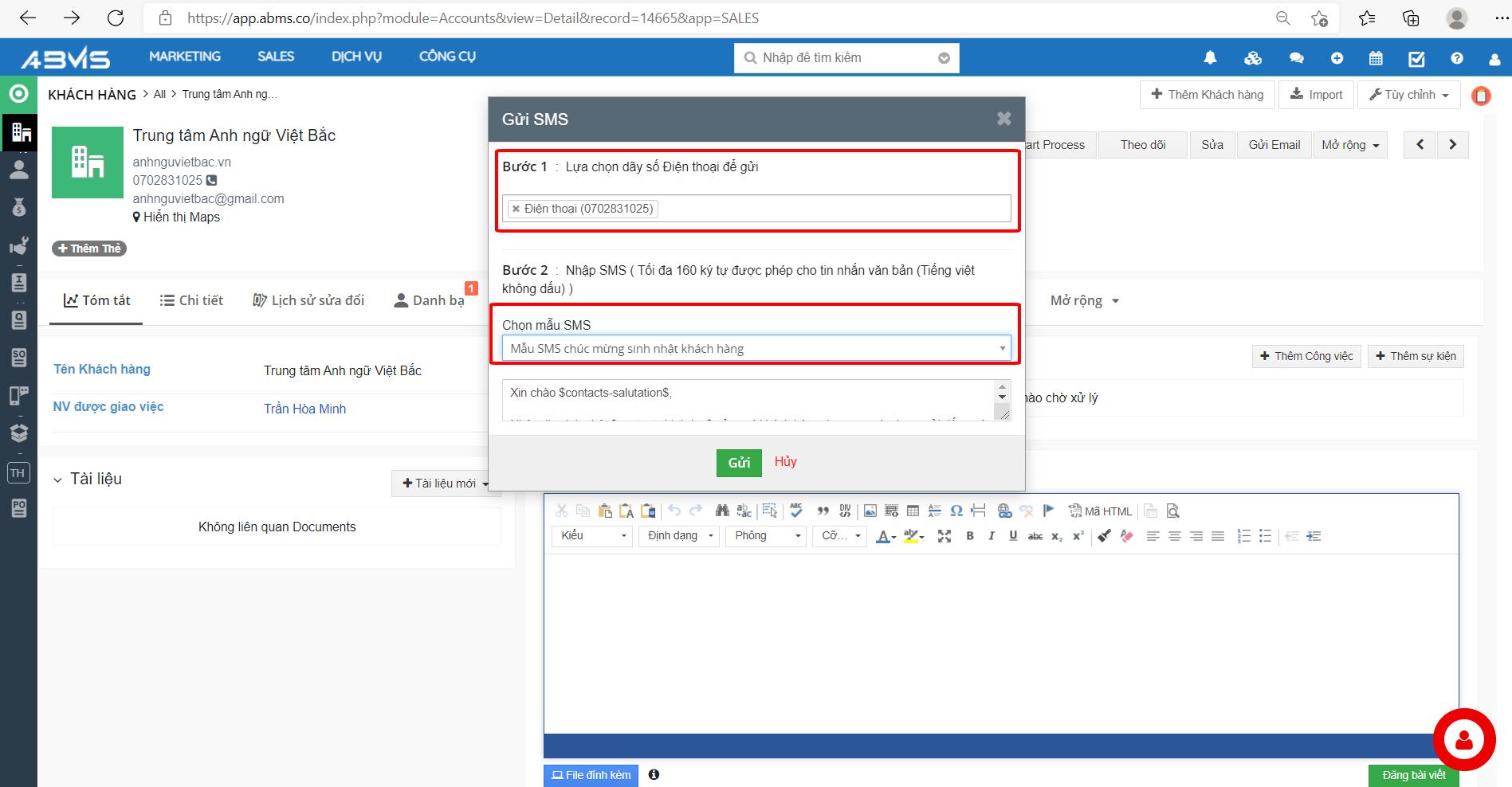 Gửi SMS trực tiếp từ module Khách hàng trên ABMS