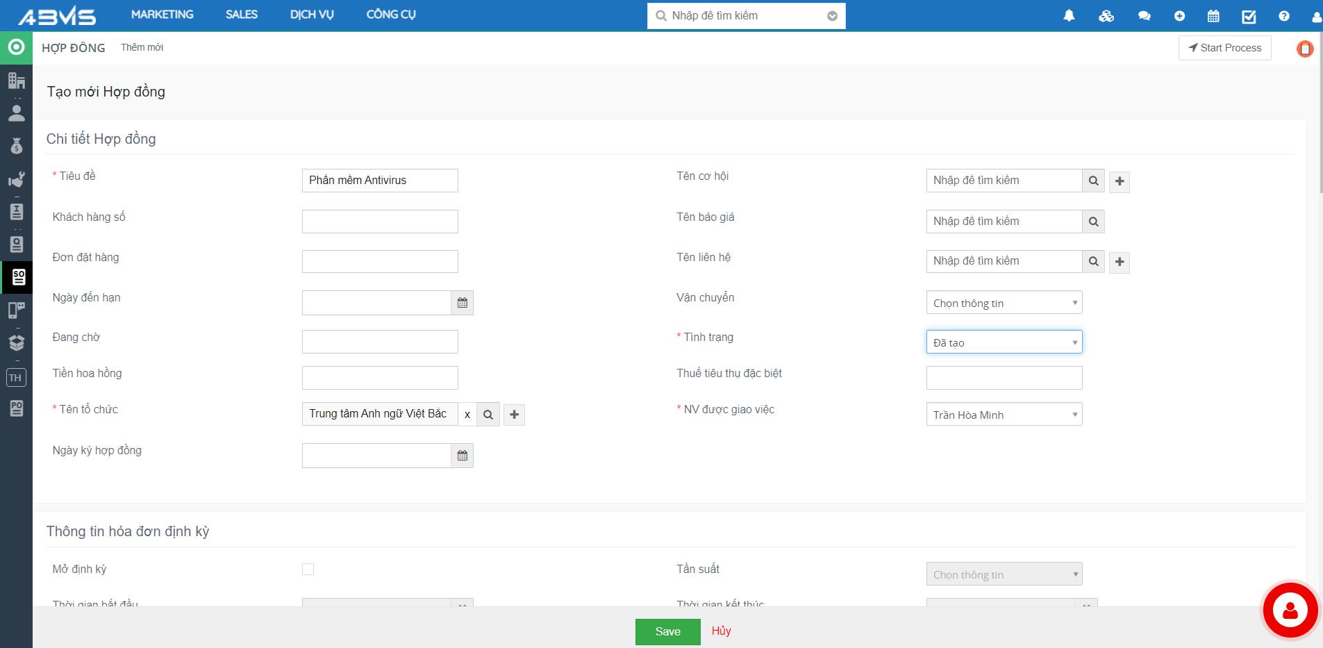 Sau khi thêm mới Hợp đồng, bạn cũng thực hiện điền đầy đủ thông tin cho hợp đồng mới dựa trên Cơ hội và báo giá tương ứng.
