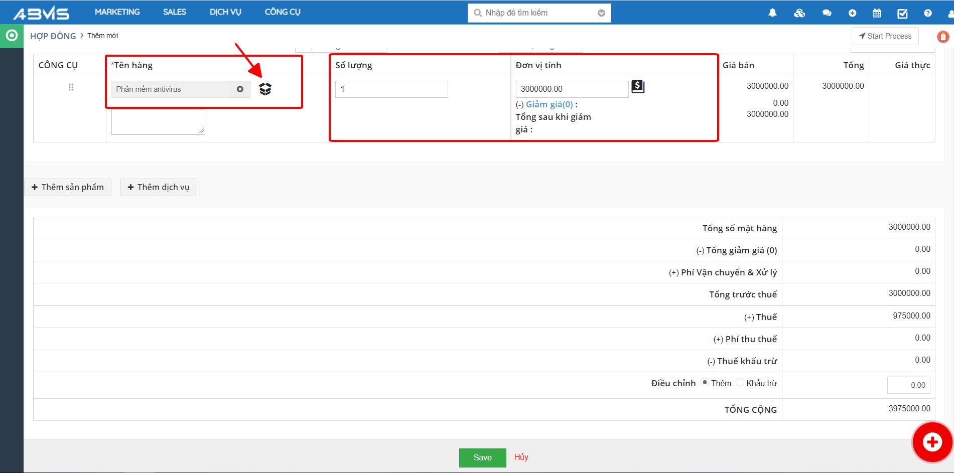 Để chọn sản phẩm, bạn bấm vào icon hộp ở phần tên hàng, lựa chọn số lượng và đơn vị tính tương ứng. Kiểm tra thuế và bấm Lưu để hoàn thành.