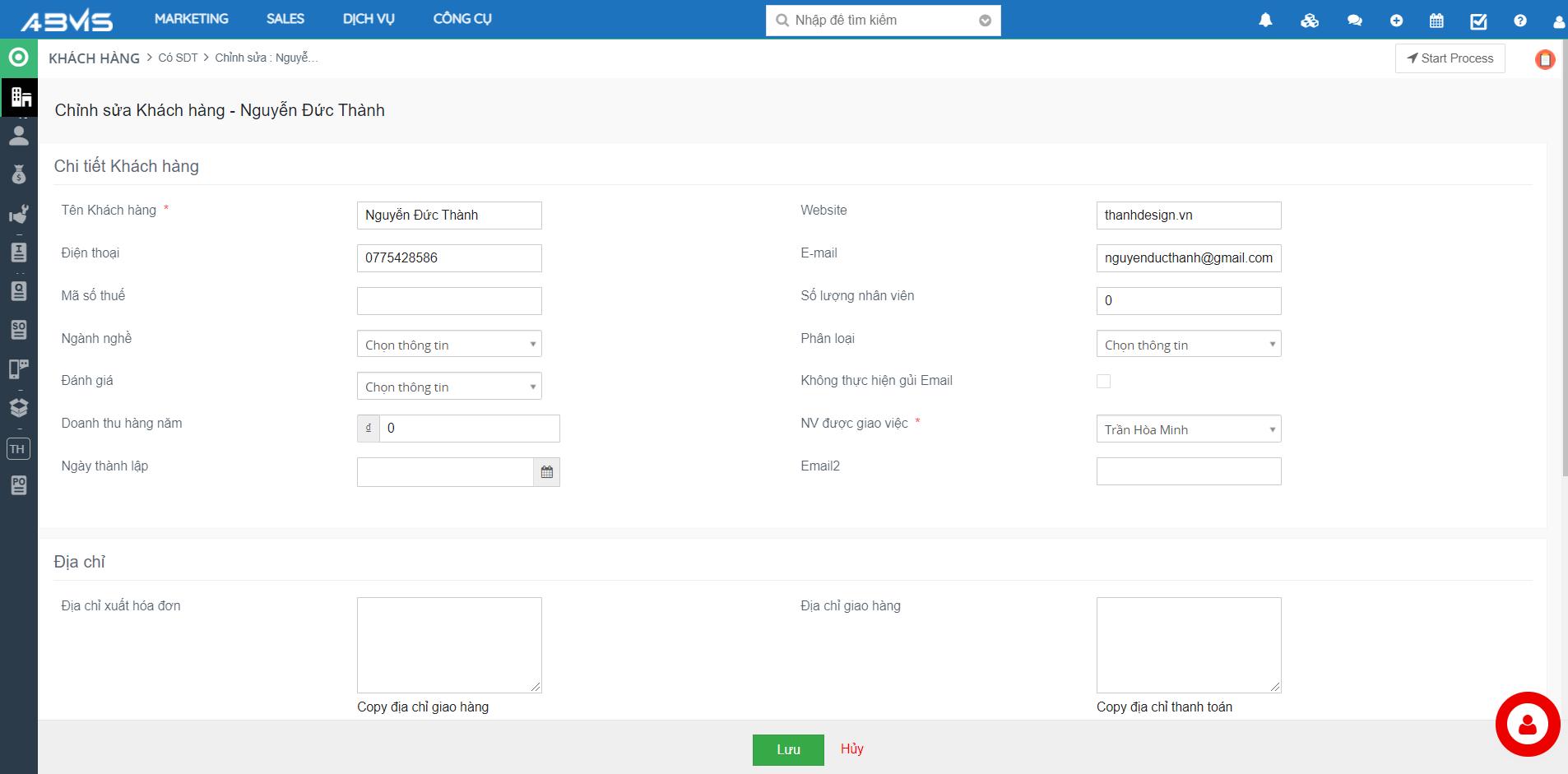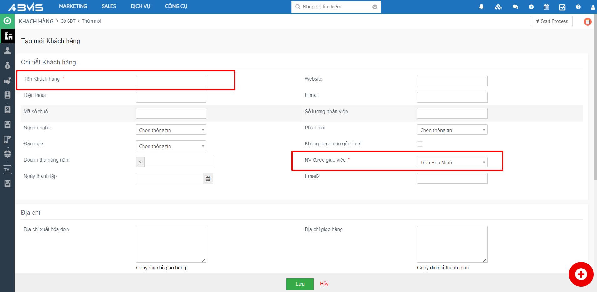Điền các thông tin bắt buộc, cũng như thông tin cần thiết cho khách hàng mới này. Lựa chọn nhân viên được giao việc tương ứng. Sâu đó bấm Lưu để hoàn thành.