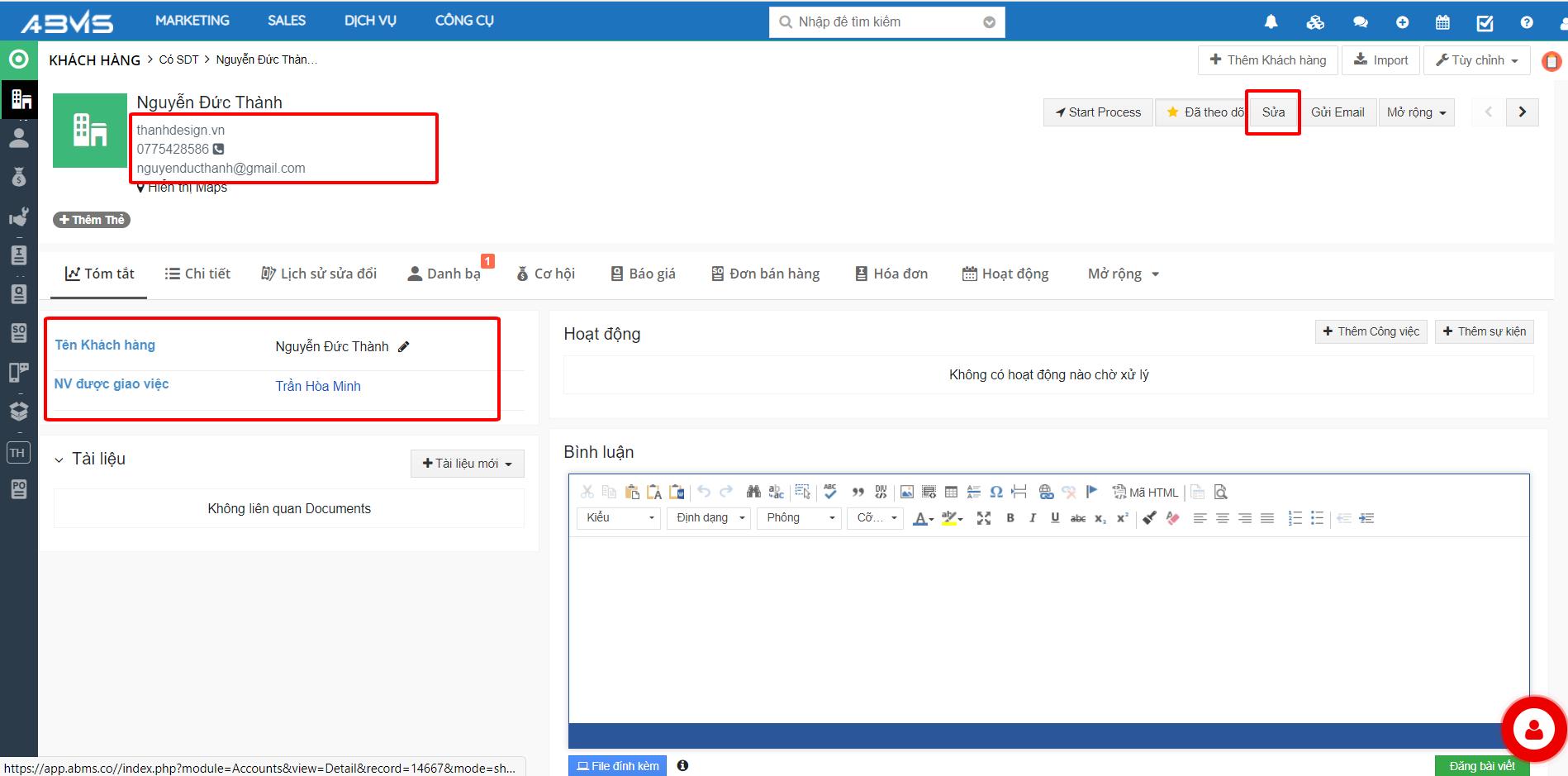 Trong quá trình làm việc, việc chỉnh sửa hoặc bổ sung thêm thông tin khách hàng luôn là cần thiết. Hoặc trường hợp khi khách hàng được chuyển giao cho Sales phụ trách chưa có đầy đủ thông tin. Sau quá trình liên hệ và trao đổi, nhân viên phụ trách này cần cập nhật thêm cho đầy đủ, để thuận tiện cho việc quản lý, cũng như quá trình bán bàn về sau.