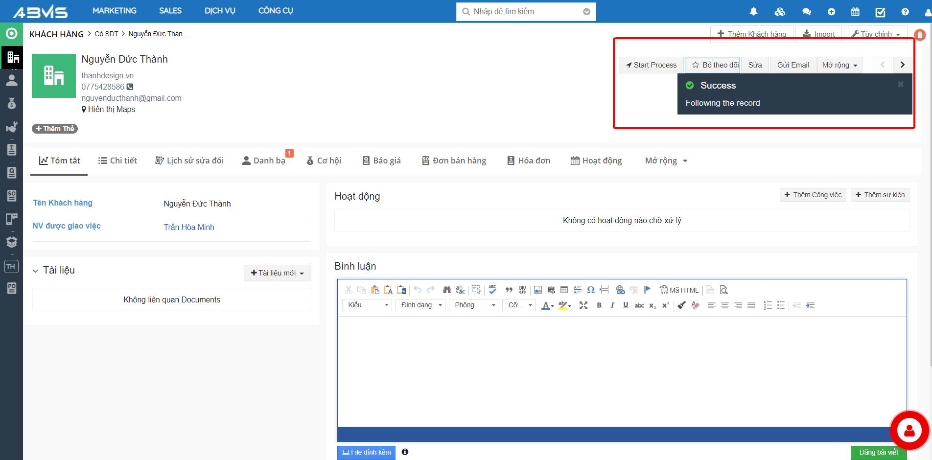 Tại Khách hàng cần theo dõi, bấm chọn nút “Theo dõi” ở góc trên bên phải màn hình. Màn hình chính sẽ hiển thị thông báo Thành công. Chọn “Bỏ theo dõi” nếu không muốn tiếp tục theo dõi Khách hàng này nữa.