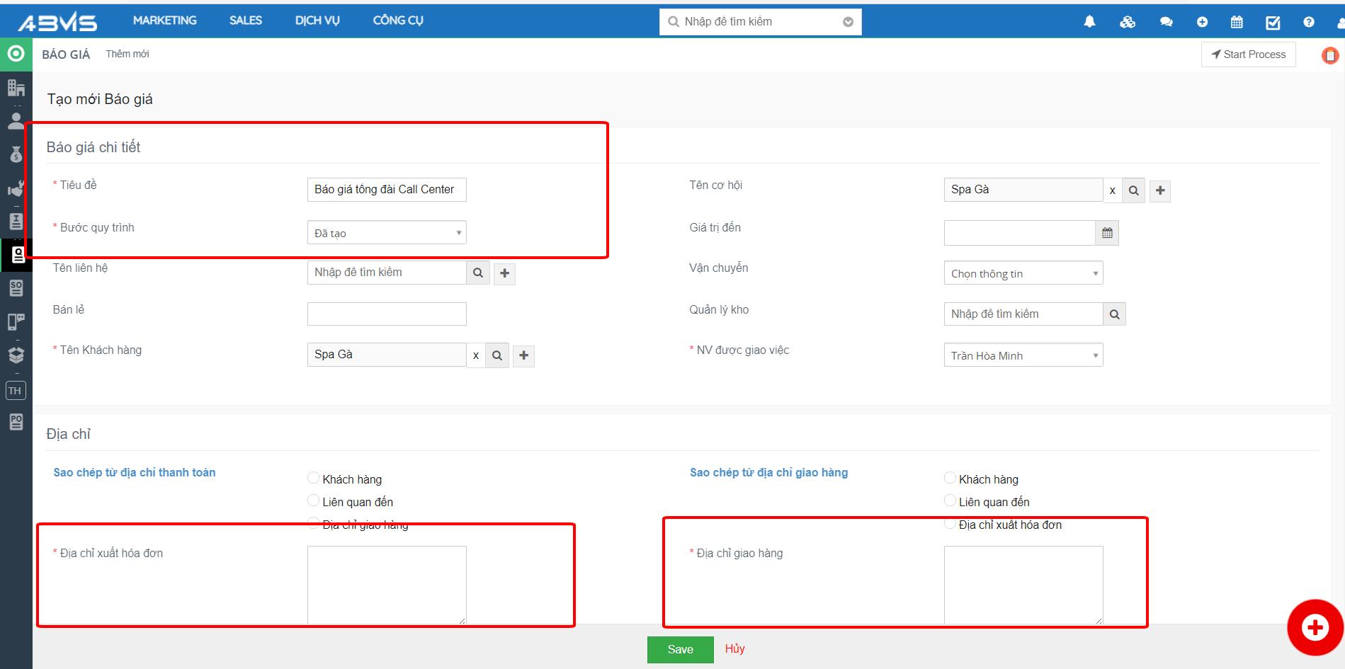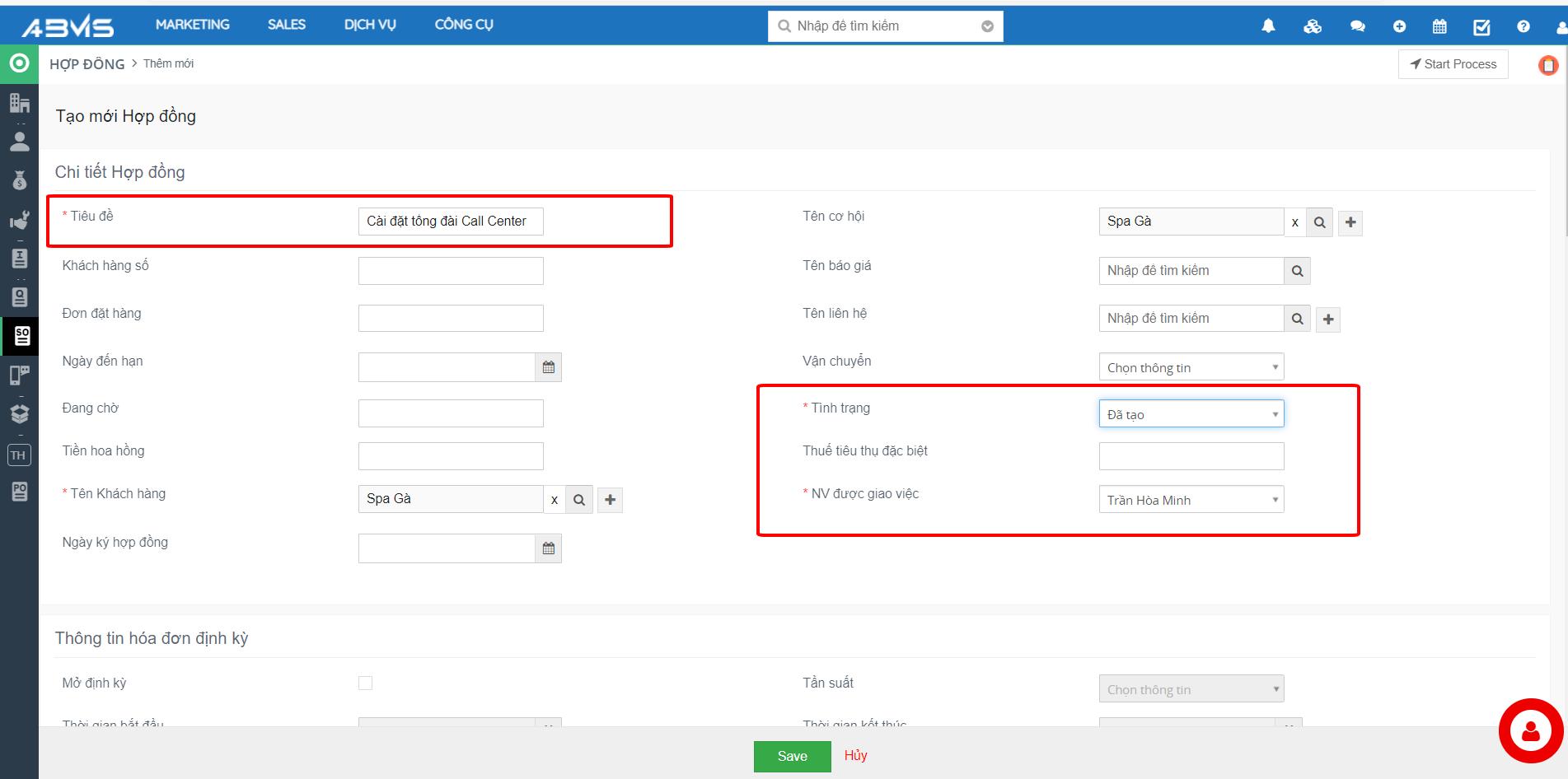 Thực hiện tương tự với các tính năng Thêm mới Báo giá và Thêm mới Hợp đồng.
