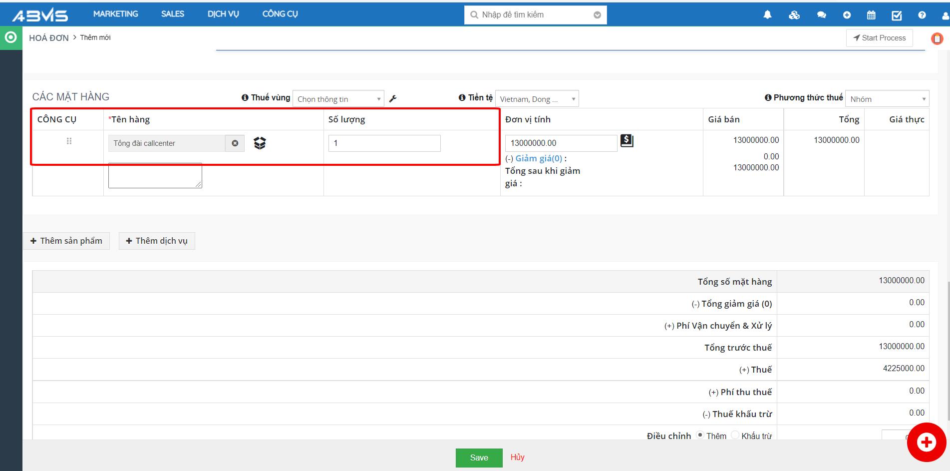Ở phần mặt hàng sản phẩm, bạn cần nhấp chuột và biểu tượng hộp để chọn sản phẩm cần thiết. Đồng thời chọn số lượng mặt hàng để ra được mức giá cuối cùng. Bấm lưu để hoàn thành bước thêm mới Hóa đơn.