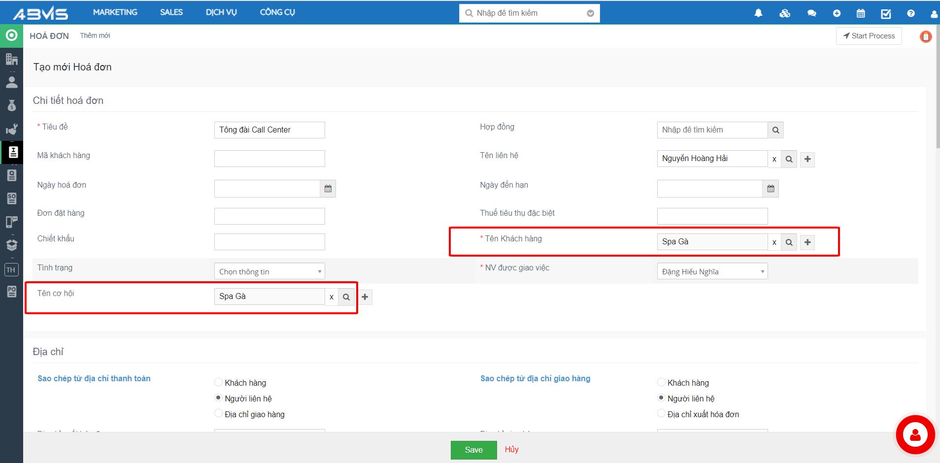 Tại đây, thông tin về Tên Cơ hội và Tên Khách hàng đã được mặc định theo thông tin của Cơ hội ban đầu. Bạn chỉ việc điền thêm các thông tin bắt buộc cần thiết khác để hoàn thành việc thêm mới Hóa đơn.