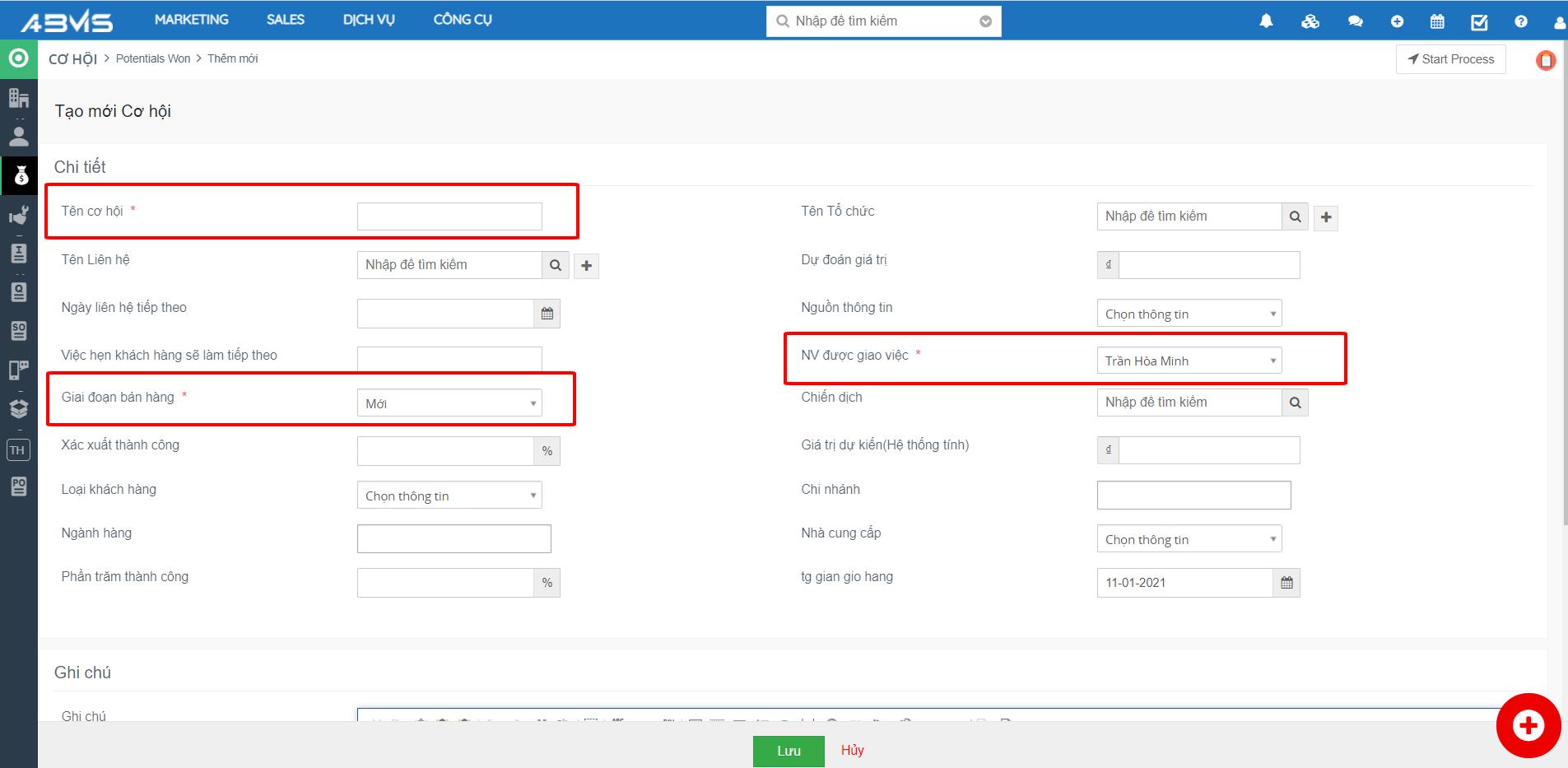 Phần chú thích sẽ dành cho yêu cầu cụ thể mà khách hàng đưa ra. Sau đó bấm Lưu để hoàn thành bước tạo mới Cơ hội.