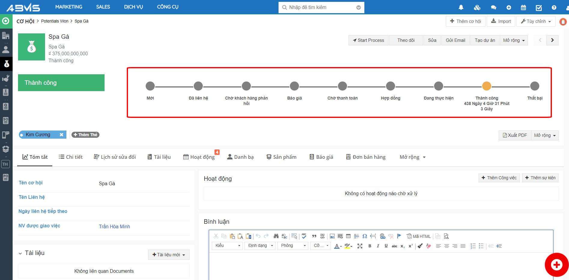 Mỗi một cơ hội cũng có thanh giai đoạn bán hàng cụ thể. Giúp nhà quản lý có thể theo dõi một cách thuận tiện nhất trạng thái hiện tại của từng Cơ hội.