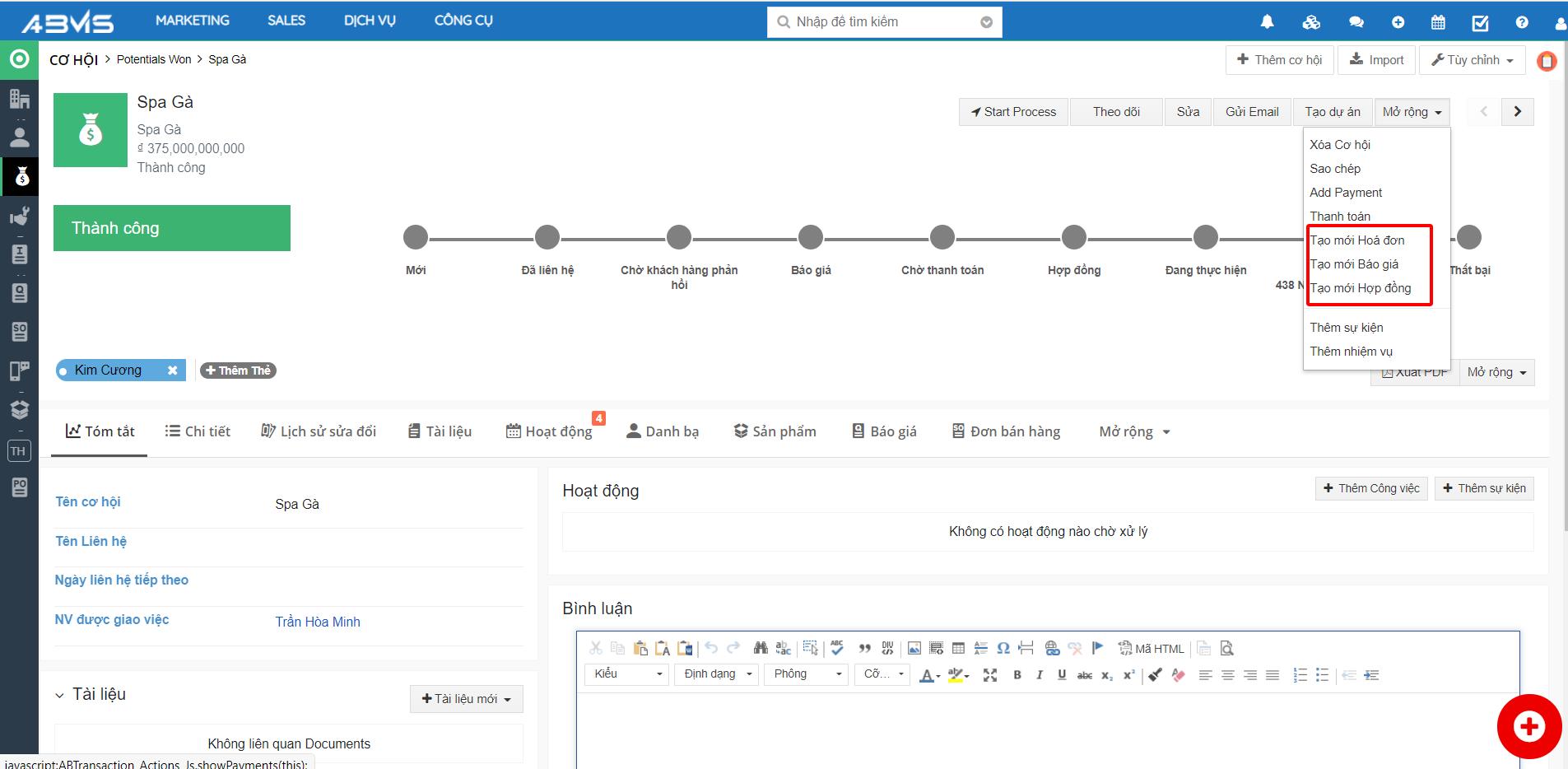 ABMS còn giúp chuyển đổi Cơ hội một cách nhanh chóng sang Hóa đơn, Báo giá hay Đơn hàng chỉ với một cú click chuột.